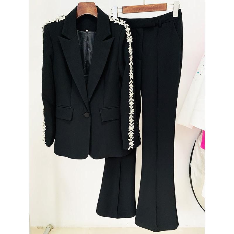 Elegant Designer Women's Beaded Blazer and Flare Pants Suit Set
