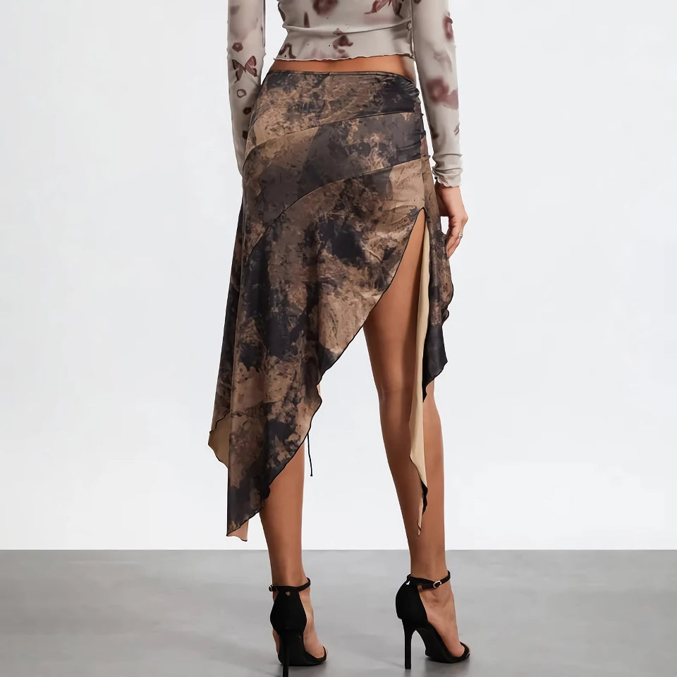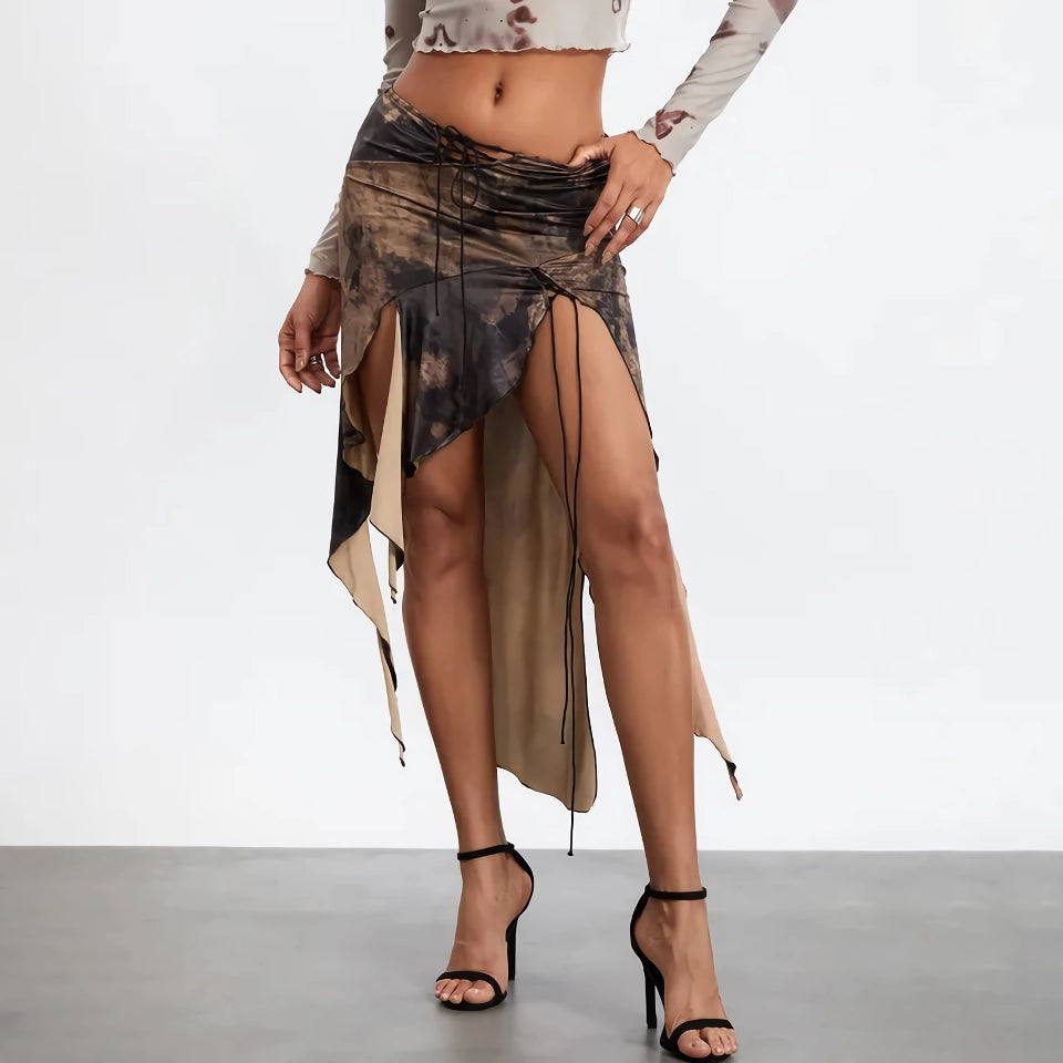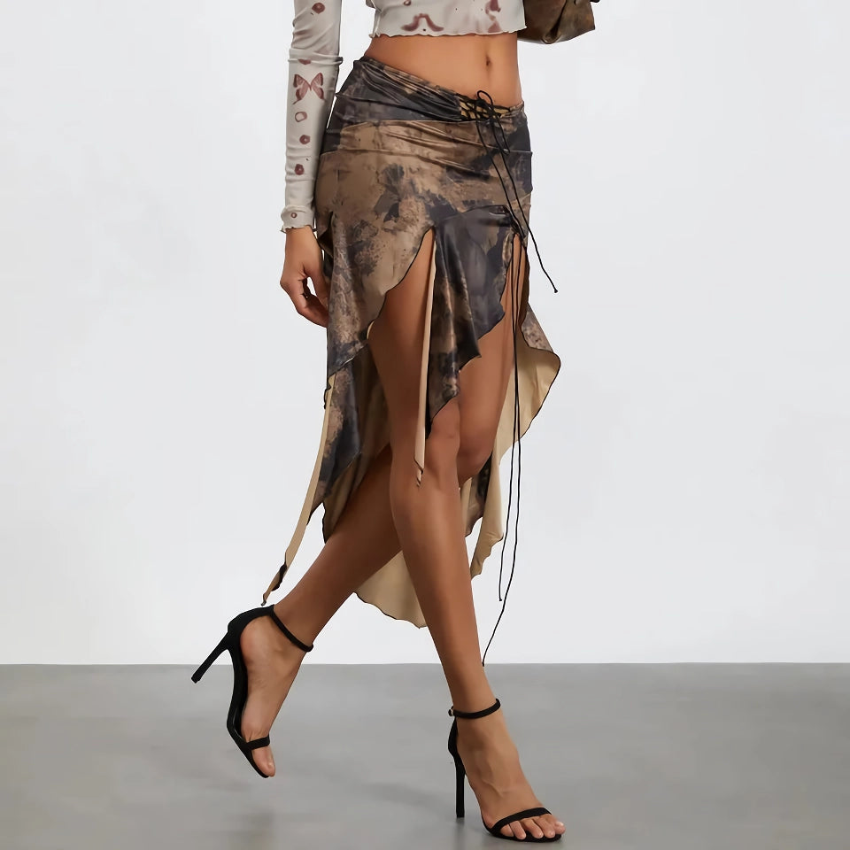 Step into summer with confidence and style in our Women’s High Split Ruffle Hem Midi Skirt. Designed with a vintage print and a seductive high split, this skirt is perfect for those who love to make a statement. The irregular ruffle hem adds a playful touch, while the front tie-up detail ensures a snug, flattering fit.Stylish Features for a Standout Look