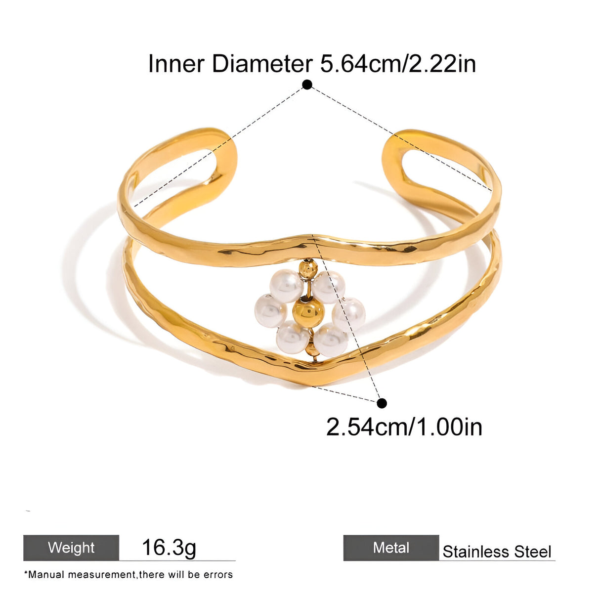 This 18K gold plated cuff bracelet is versatile enough to wear with both casual and formal attire. Its eye-catching imitation pearls and flower accents make it a great accessory for special events such as weddings or anniversaries, while the minimalist double-layer design ensures it blends seamlessly with your everyday wardrobe. Whether you're looking to make a statement or add a subtle touch of elegance, this bracelet is the perfect choice for enhancing your style.