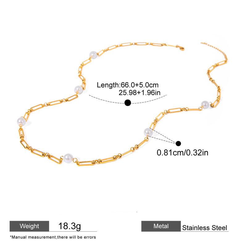 Elevate your look with this beautifully crafted 18K PVD gold plated stainless steel round imitation shell pearl necklace. Designed to add a touch of elegance to any outfit, this necklace is perfect for women who appreciate both timeless and trendy jewelry. Whether you're heading to a party, attending a wedding, or celebrating an anniversary, this necklace enhances your ensemble with its graceful and sophisticated design. The round imitation shell pearl offers a delicate, yet striking focal point, making it an ideal accessory for any occasion.