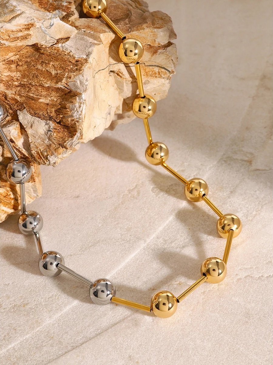 Elevate your look with this sleek and modern 18K Gold PVD Plated Stainless Steel Beaded Clavicle Chain Necklace. Perfect for women who love a minimalist yet bold statement, this necklace exudes sophistication and adds a trendy touch to any outfit. Designed with a chic metallic texture, it features durable stainless steel construction and long-lasting 18K PVD gold plating for a luxurious finish that won’t fade or scratch over time.Stylish, Durable, and Versatile