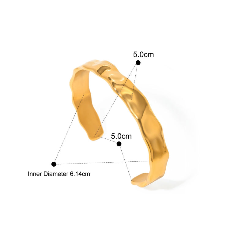 Elevate your jewelry collection with our stunning Waterproof Wide Cuff Bracelet. Crafted from high-quality 316L stainless steel and plated with luxurious 18K PVD gold, this bracelet exudes sophistication and style. Its wide design and textured surface make it a statement piece that can easily transition from casual outings to elegant evenings. Whether you're dressing up for a special occasion or adding flair to your everyday look, this cuff bracelet is a perfect choice.Unmatched Quality and Durability