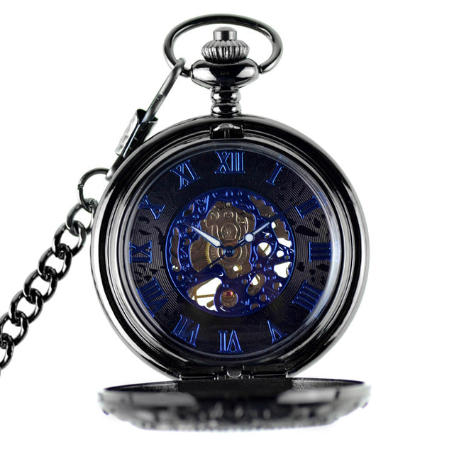 Retro Flip New Roman Blue Surface Mechanical Pocket Watch