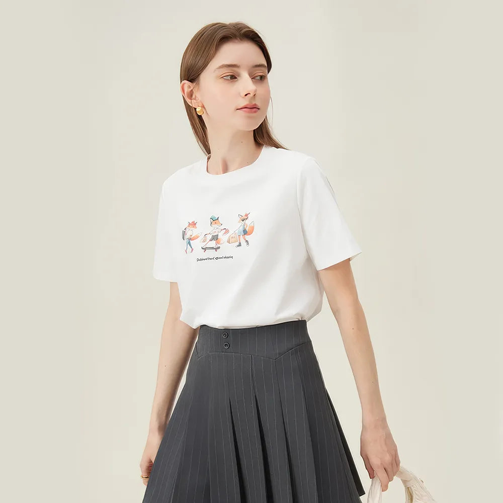 Elevate your summer wardrobe with our charming White Fox Print Round Neck Tee for Women. Crafted from a blend of high-quality cotton and polyester, this tee offers both style and comfort, making it a must-have for the season. Featuring a captivating fox print design, this tee stands out with its playful yet minimalist aesthetic. The regular short sleeves and classic O-neck collar ensure a timeless appeal, perfect for various occasions.