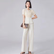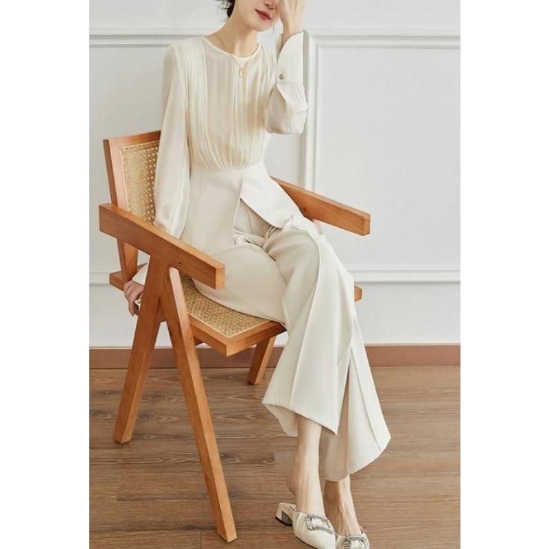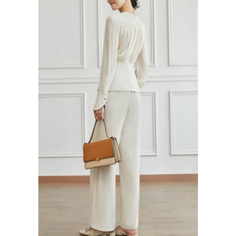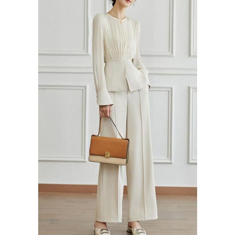 Our set features a mid-waist design that flatters your figure, paired with wide leg pants that offer both comfort and style. The laminated fabric, comprising 31% to 50% polyester, ensures durability and a gentle feel against the skin. With its full-length shirt sleeves and O-neck collar, this ensemble exudes a chic and timeless elegance. The pants come with a convenient zipper fly for easy wear.