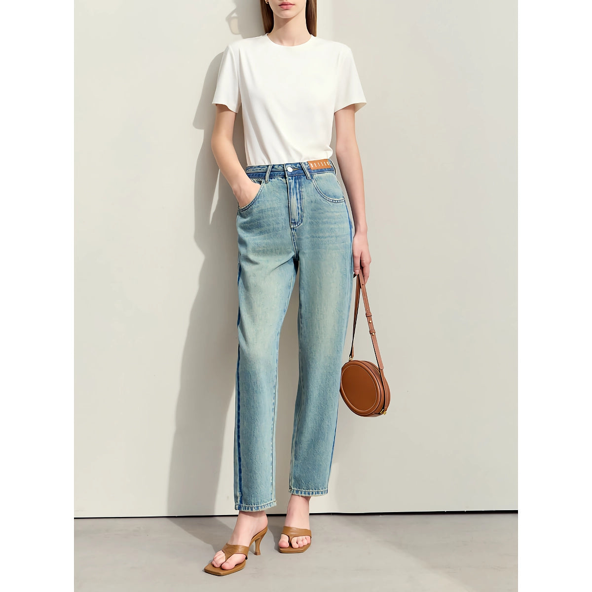 Our Minimalist Women's Patchwork Denim Tapered Jeans are packed with features that make them a standout addition to your wardrobe:- Material: High-quality cotton and polyester blend for durability and comfort