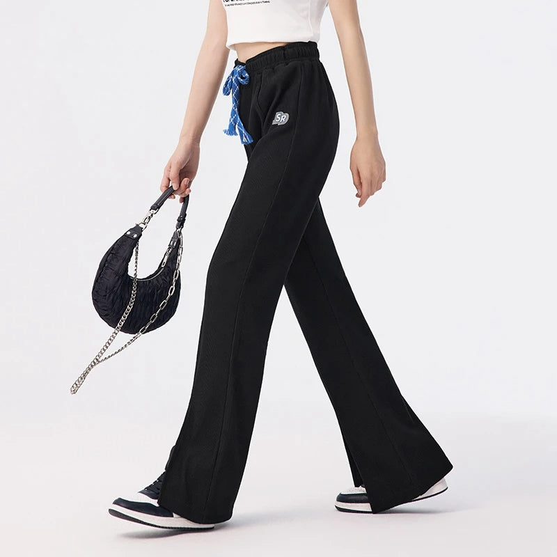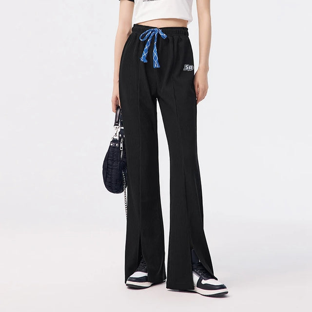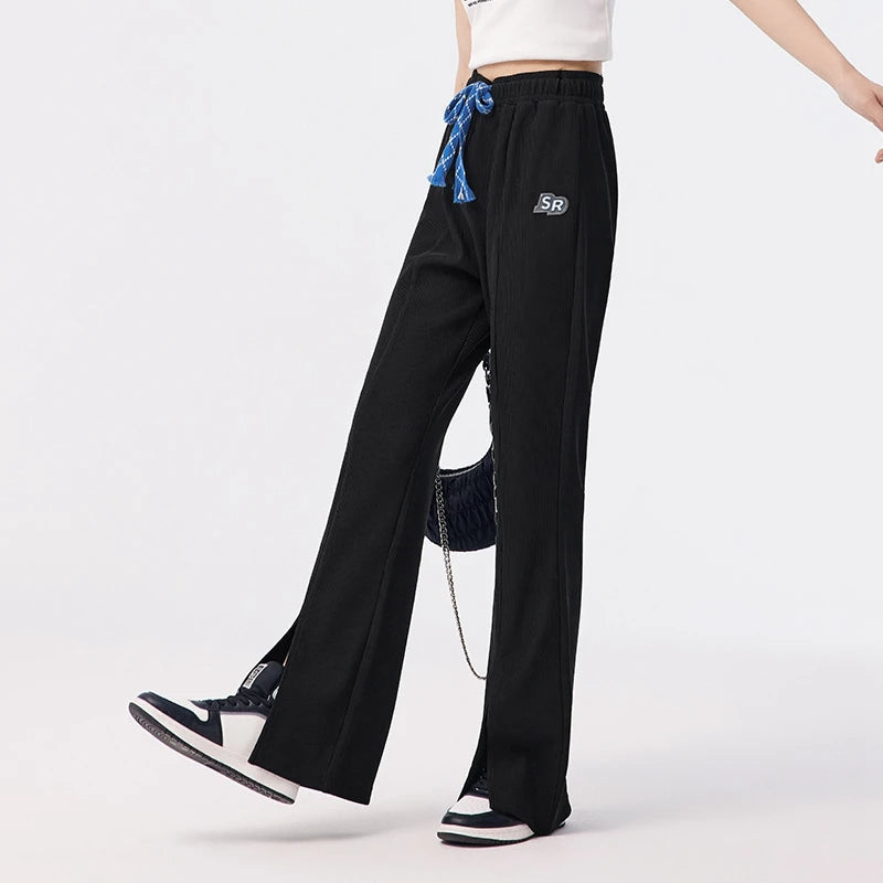 These flared pants feature a unique split design that adds a trendy flair to your outfit. The mid-waist fit and wide-leg style provide a flattering silhouette, while the pleated front and lace-up decoration enhance their chic appeal. The drawstring closure ensures a secure and adjustable fit, and the pockets add both functionality and style.- Material: Polyester and Spandex blend for slight stretch and comfort
