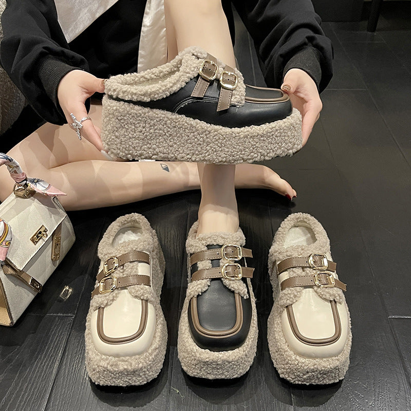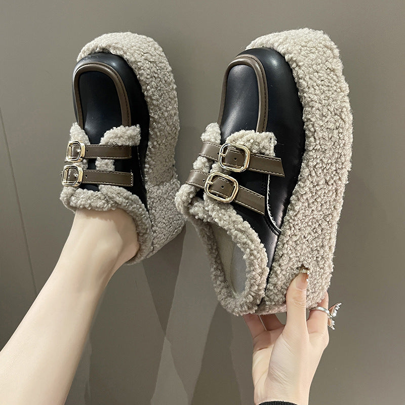 Fashion Korean Style Belt Buckle Outer Wear Fleece-lined Wedge Slippers