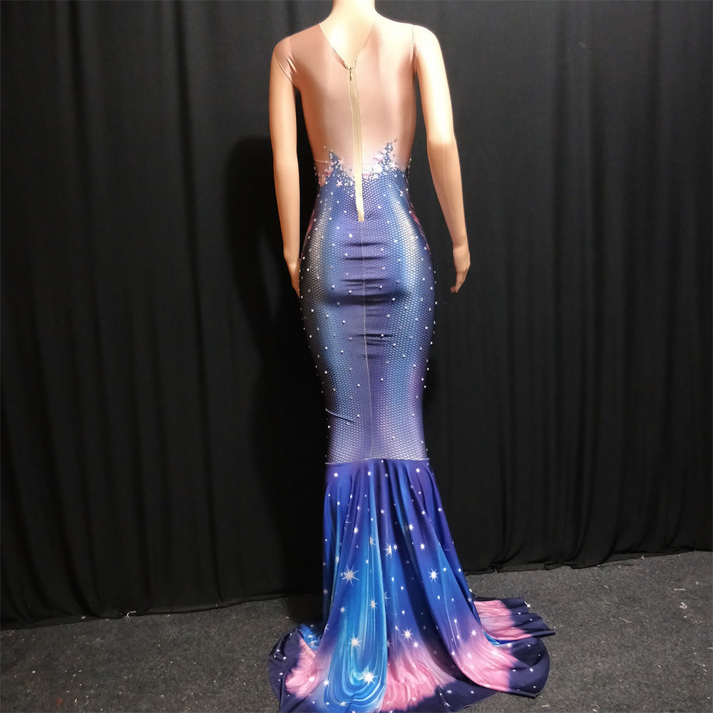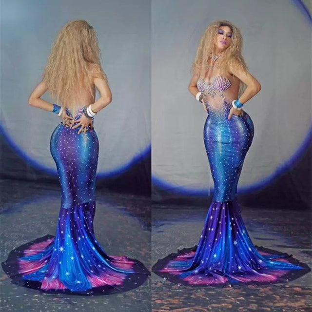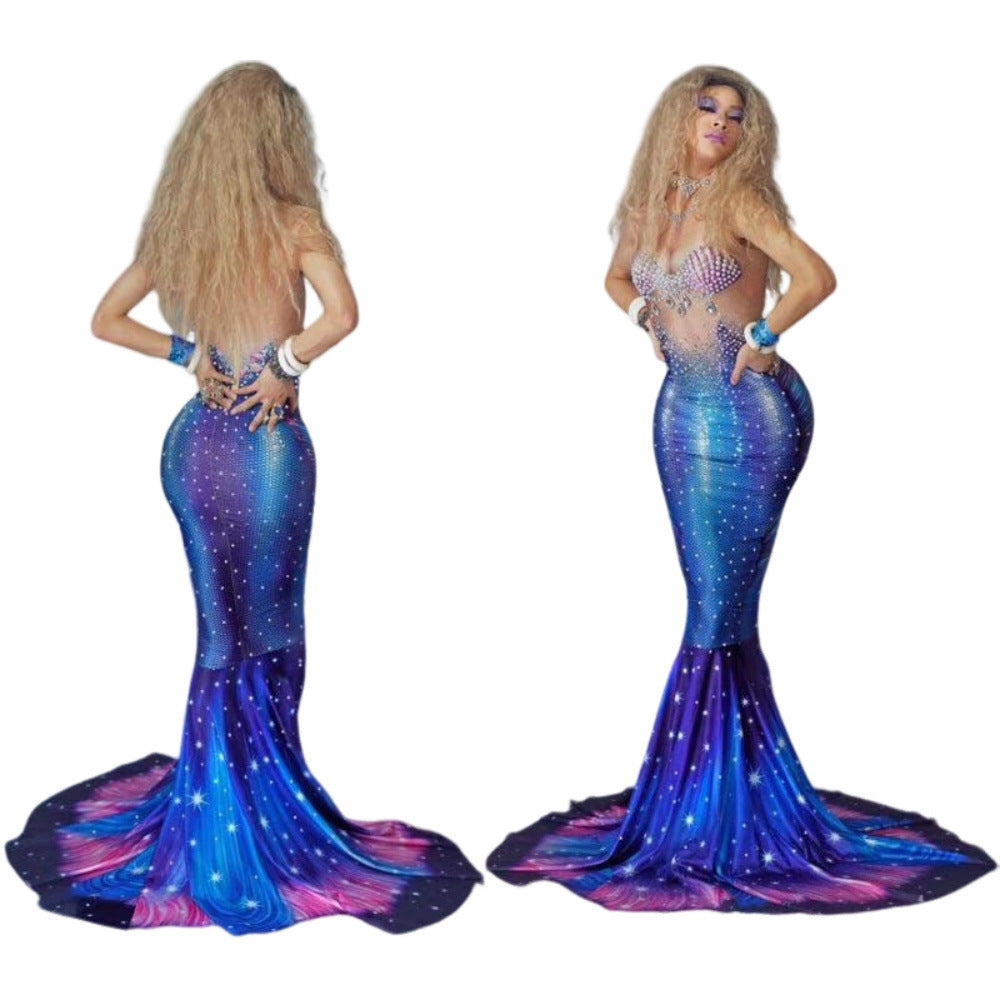 Mermaid Costume Blue Piranha Female Singer Hot Drilling
