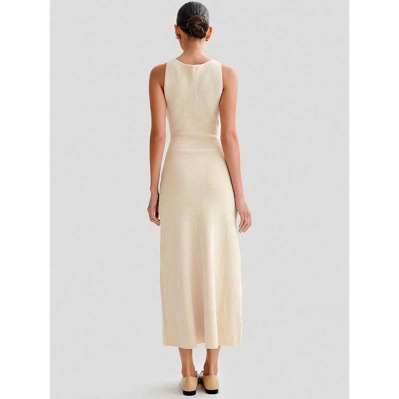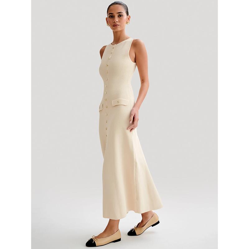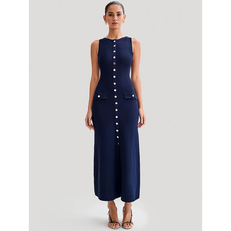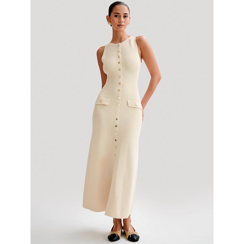 What sets our dress apart is its combination of classic style and modern convenience. The O-neckline and button decoration give it a timeless appeal, while the sleeveless design and pockets add practicality. The high-quality knit fabric ensures a comfortable fit that moves with you, making it ideal for any occasion. Plus, the ankle-length silhouette adds a touch of elegance that makes this dress truly special.
