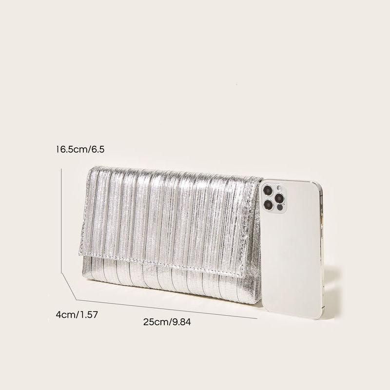 What sets this evening bag apart is its blend of luxury, functionality, and ethical fashion. The soft, shiny silver PU vegan leather is not only eye-catching but also a nod to sustainable fashion choices. The gold metal chain adds a touch of glamour, making it a standout accessory. Its practical size ensures you can carry all your essentials without compromising on style. This bag isn't just an accessory; it's a statement.Make It Yours Today