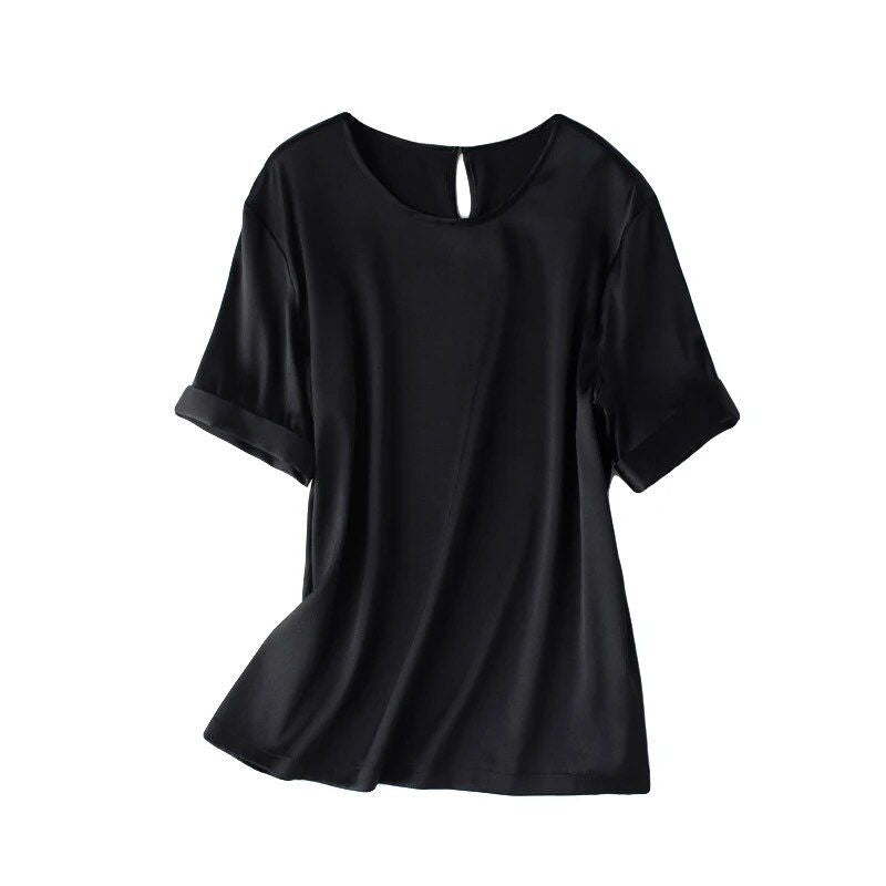 This versatile Navy Silk Tee is perfect for the summer season. It's ideal for those warm days when you want to look effortlessly stylish without compromising on comfort. Pair it with your favorite jeans for a casual day out, or tuck it into a skirt for a more formal look. Its timeless design ensures that you can wear it for various occasions, from casual meet-ups to more sophisticated gatherings.Why Choose Our Silk Tee?