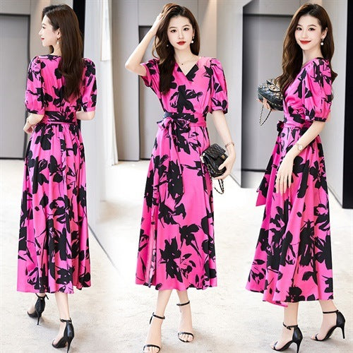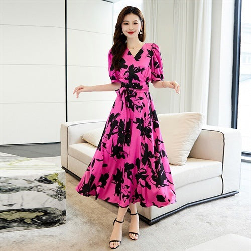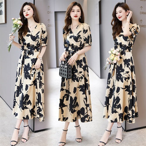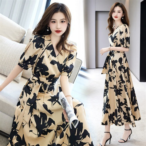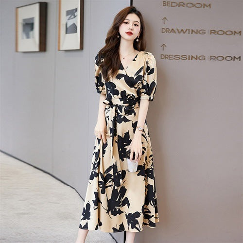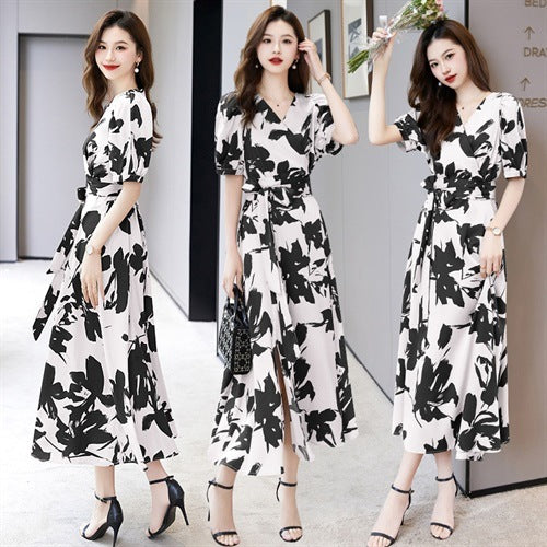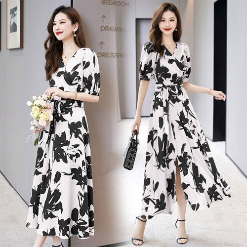 Fashion V-neck Printed Short Sleeve Dress Women - Black And White Flowers / M is backordered and will ship as soon as it is back in stock.