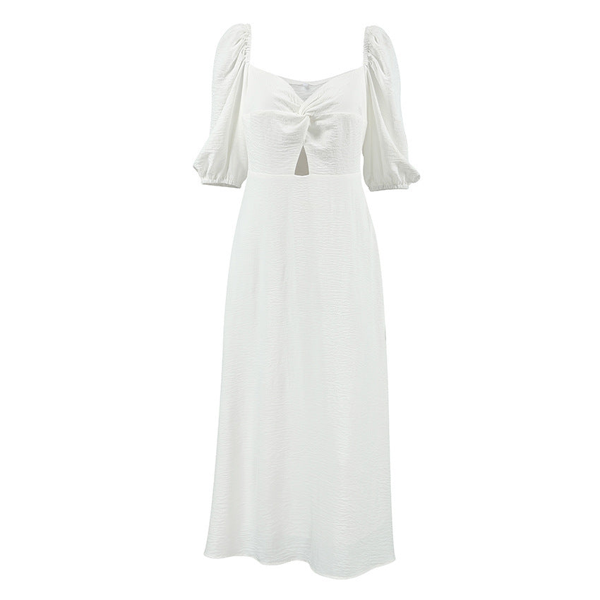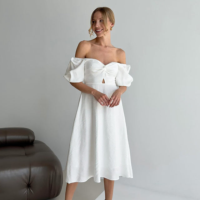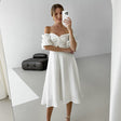 French Elegant Lantern Sleeve Off-neck Dress - White / S is backordered and will ship as soon as it is back in stock.