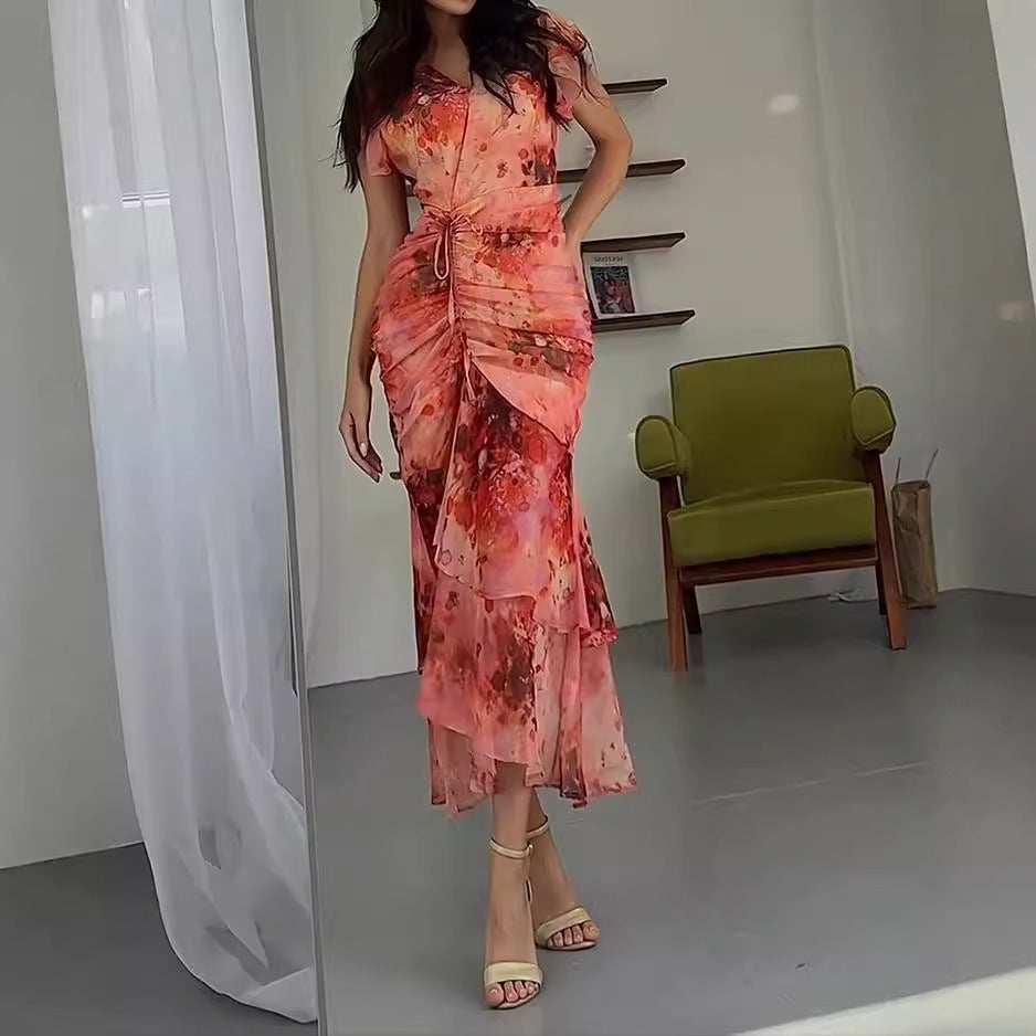 Women's V-neck Pleated Print Dress