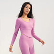 Step into your next yoga session with confidence and style with our Long Sleeve Yoga Shirt. Designed for the modern woman who values both performance and aesthetics, this top combines functionality with a sleek design. Crafted from a blend of 87% nylon and 13% spandex, this shirt offers a soft, breathable fit that moves with you. The round neck and U-neck hollow design add a touch of elegance, making it perfect not just for workouts, but also for casual wear.