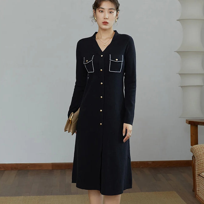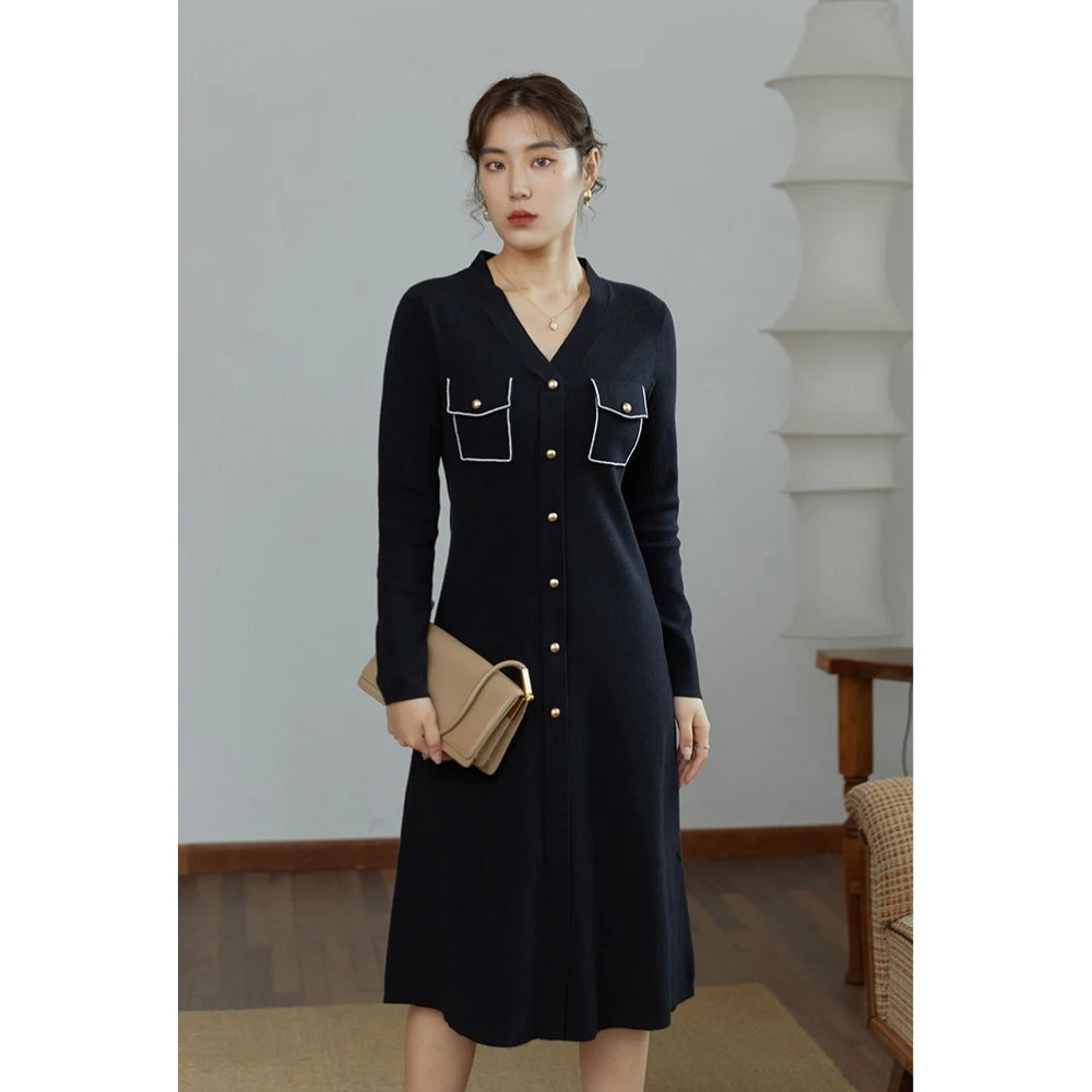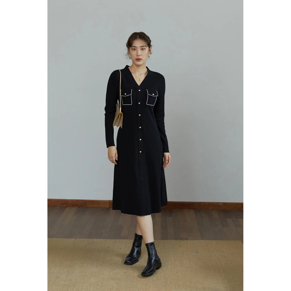 Elegant Black V-Neck Knitted A-line Winter Dress