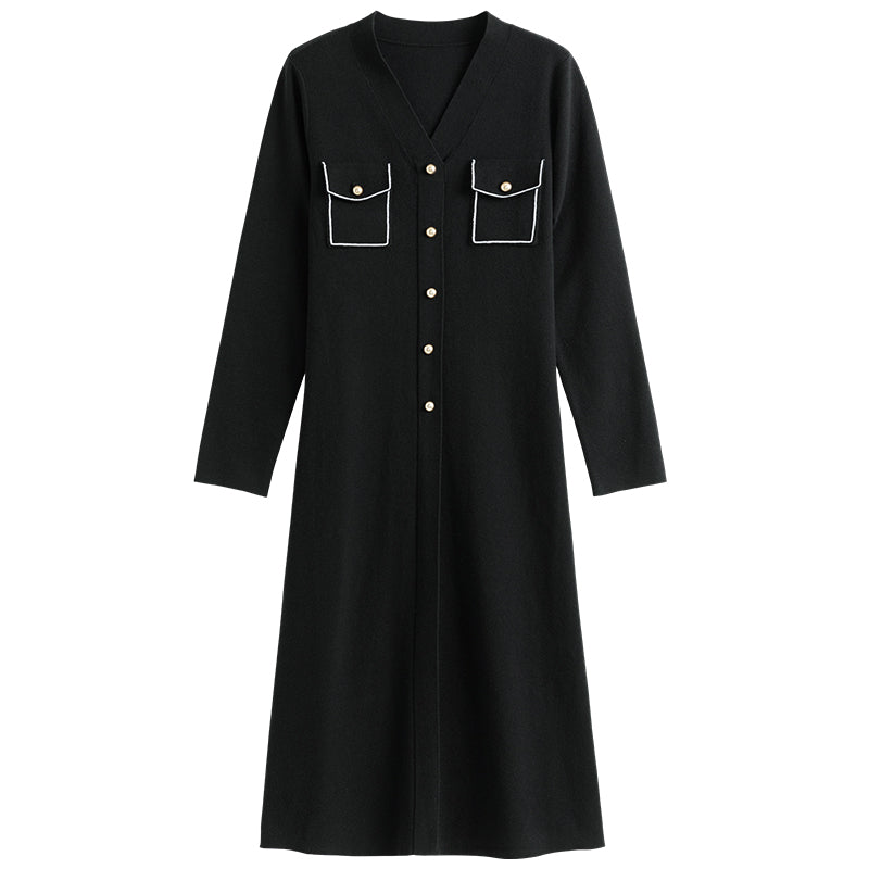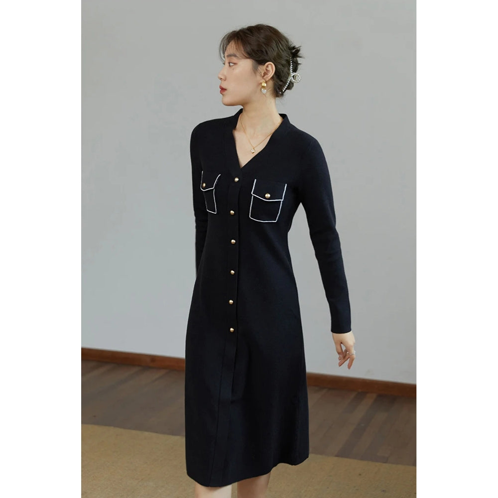 The Elegant Black V-Neck Knitted A-line Winter Dress stands out with its unique combination of style and comfort. The A-line silhouette is universally flattering, accentuating your waist while allowing for easy movement. The high-quality knit fabric provides warmth without sacrificing style, and the practical pockets add a touch of functionality.- Flattering A-line silhouette