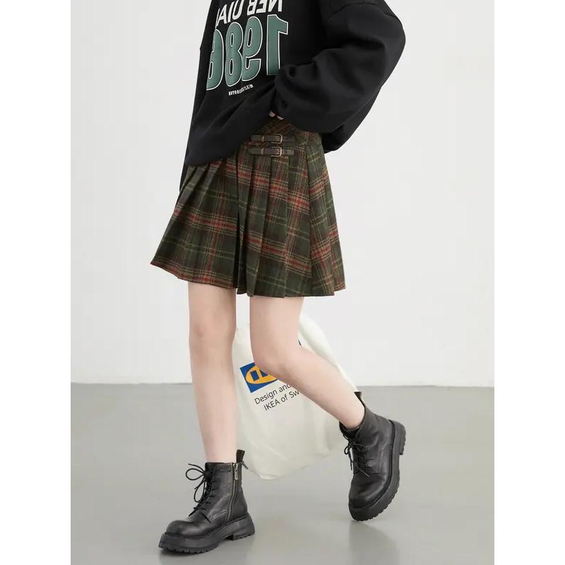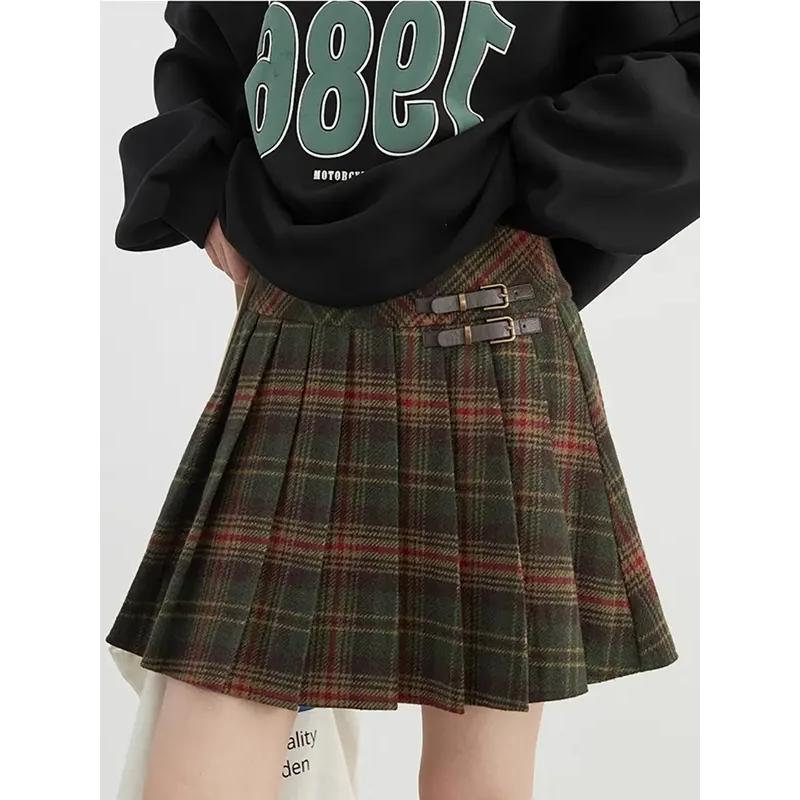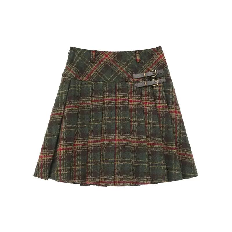 High Waist Wool Plaid A-line Pleated Skirt for Spring and Autumn