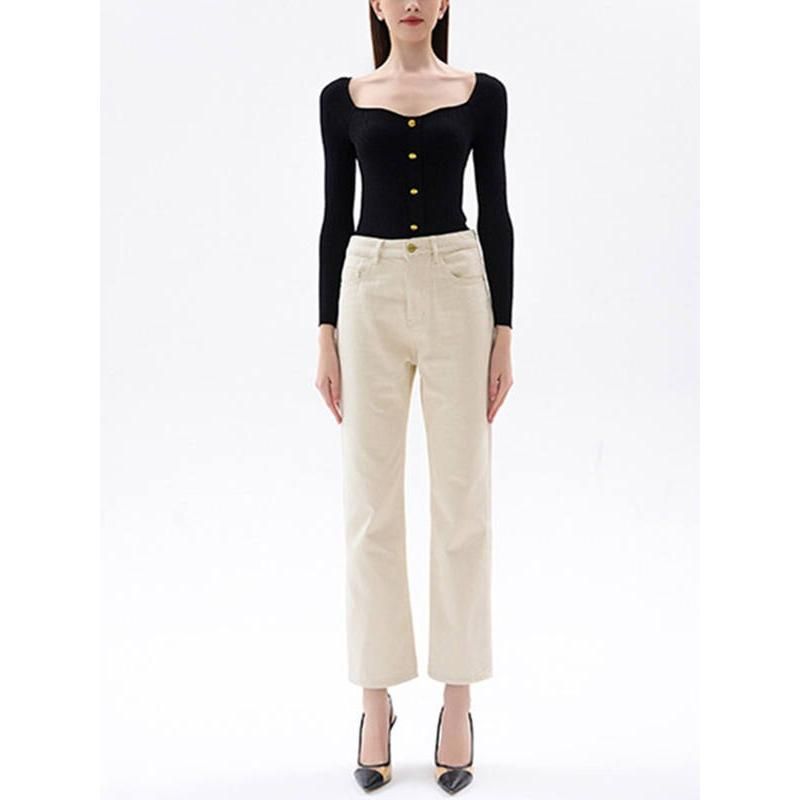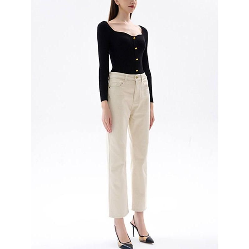 Our jeans stand out with their attention to detail. The elegant button decoration adds a touch of sophistication, while the zipper fly closure ensures a secure and comfortable fit. Designed with the needs of the modern woman in mind, these jeans are both stylish and practical, embodying the essence of the "Office Lady" style.