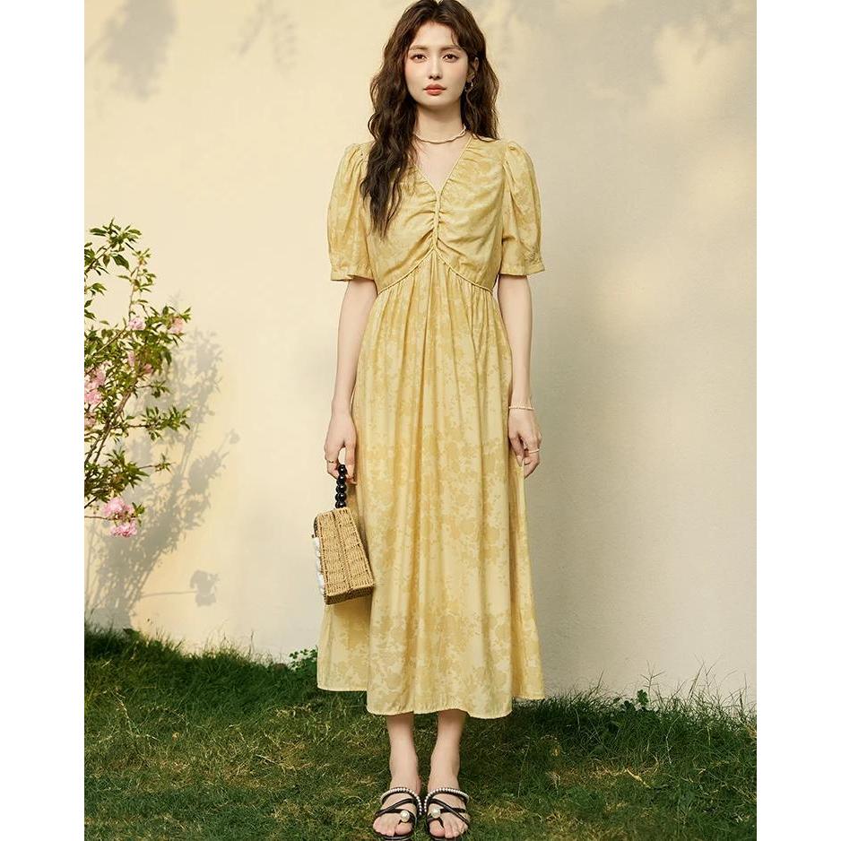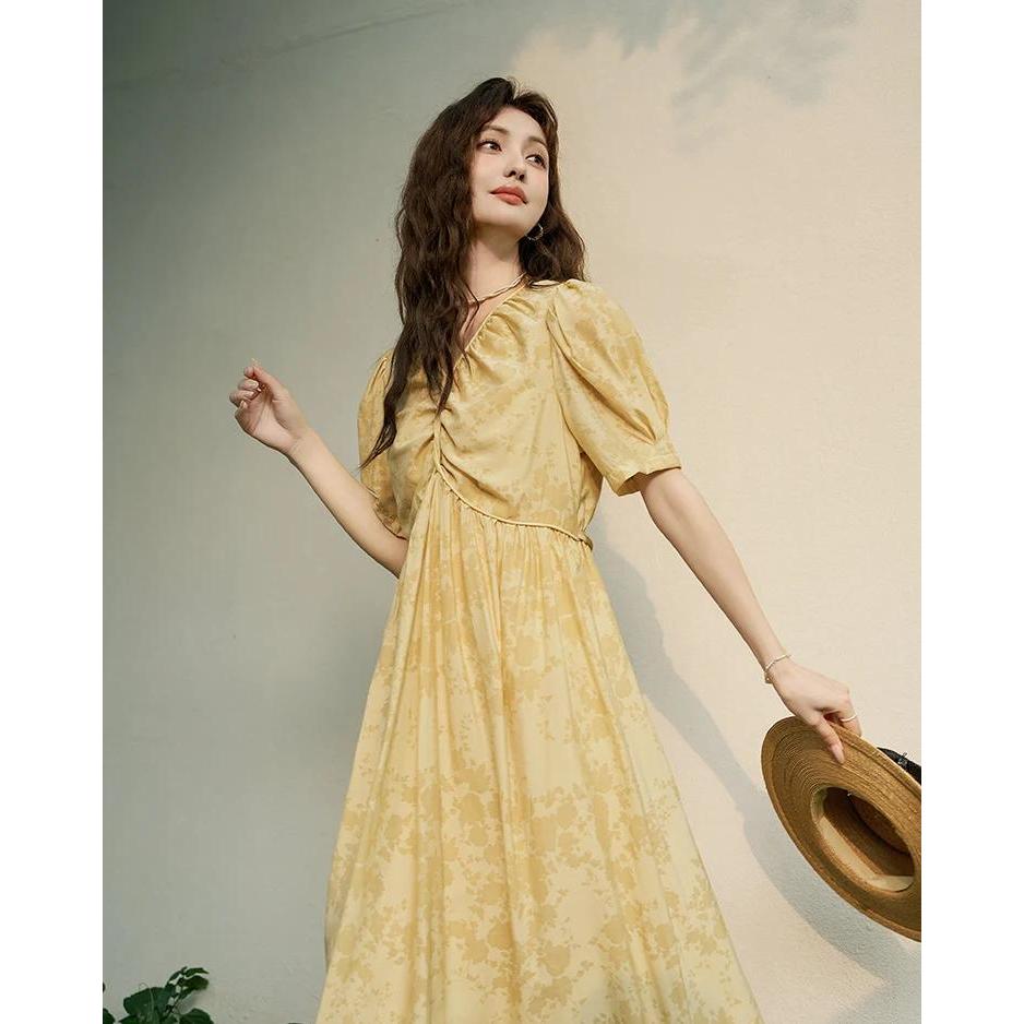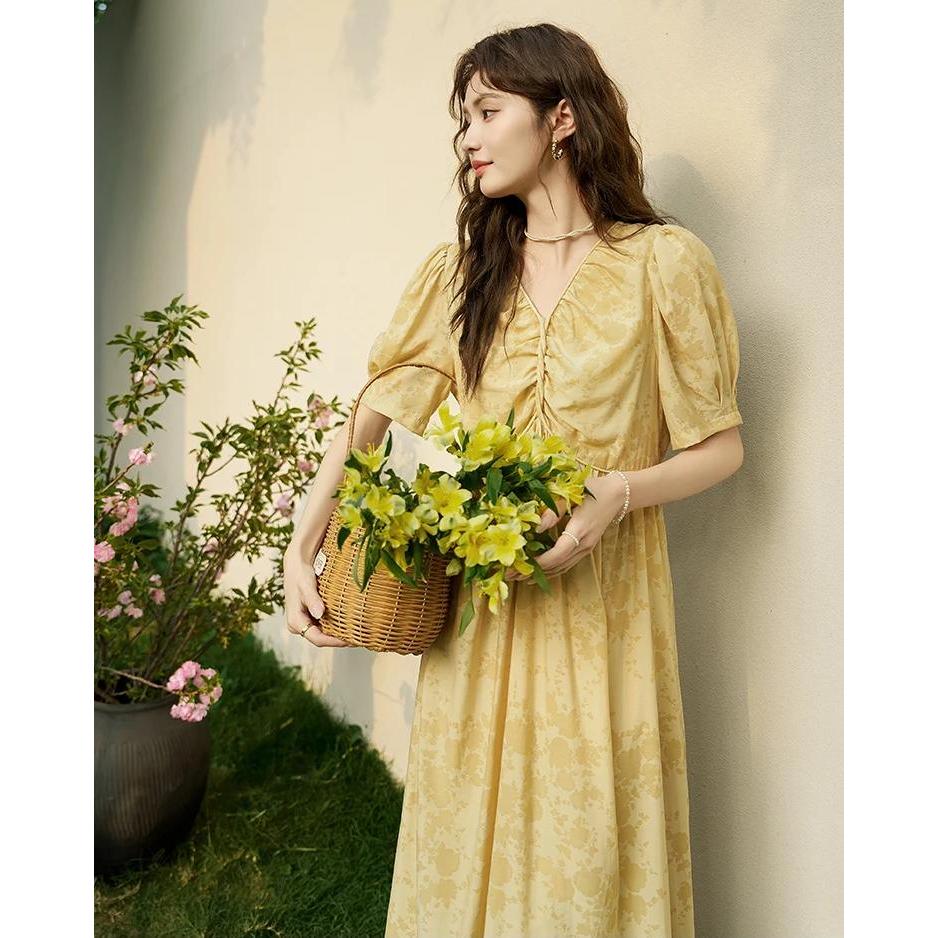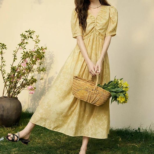 Step into the season of sunshine with our Elegant Summer V-Neck Chiffon Floral Dress. Designed to capture the essence of French sophistication, this dress is perfect for every woman looking to add a touch of charm and grace to her wardrobe. The V-neckline combined with the puff sleeves creates a flattering silhouette that is both timeless and contemporary, ensuring you stand out in any crowd. Crafted from a luxurious cotton blend fabric, this dress offers medium stretch, making it incredibly comfortable to wear all day long. The floral pattern adds a whimsical touch, while the loose A-line fit flatters all body types, providing a relaxed yet elegant look. Whether you're attending a tea party, a casual outing, or a special event, this dress will keep you looking chic and feeling confident. The mid-calf length and empire waistline accentuate your figure, while the short puff sleeves add a playful touch. Made from a blend of polyester and viscose, this dress is lightweight and breathable, perfect for the warm summer months. The Office Lady style makes it versatile for both professional settings and leisurely afternoons. What sets this dress apart is its blend of classic design and modern comfort. The V-neckline is universally flattering, and the floral pattern is both trendy and timeless. The dress is released in the summer of 2024, making it a fresh addition to your wardrobe that aligns with current fashion trends.