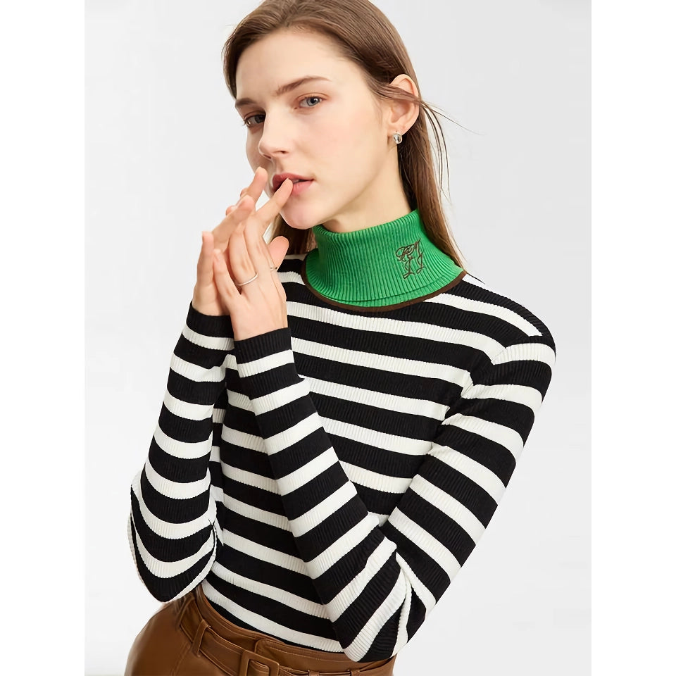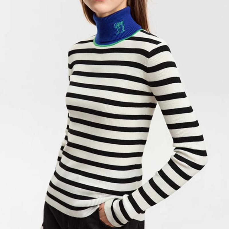 Step into the season with style and confidence wearing the Minimalist Winter Striped Turtleneck Sweater. This chic and cozy top is perfect for those who appreciate fashion with a touch of elegance. Designed for the modern woman, this sweater combines a sleek, slim-fit silhouette with the timeless charm of stripes and subtle embroidery, making it a must-have addition to your winter collection.