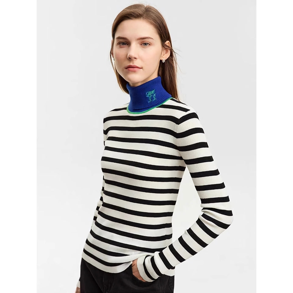 This sweater isn't just about looking good; it's about feeling good too. The thoughtful blend of materials, including the luxurious touch of mulberry silk and wool, ensures you stay warm and cozy throughout the colder months. The slim-fit design accentuates your curves while providing enough stretch for a comfortable fit. The timeless striped pattern and elegant embroidery make this sweater versatile enough for both casual and dressier occasions.