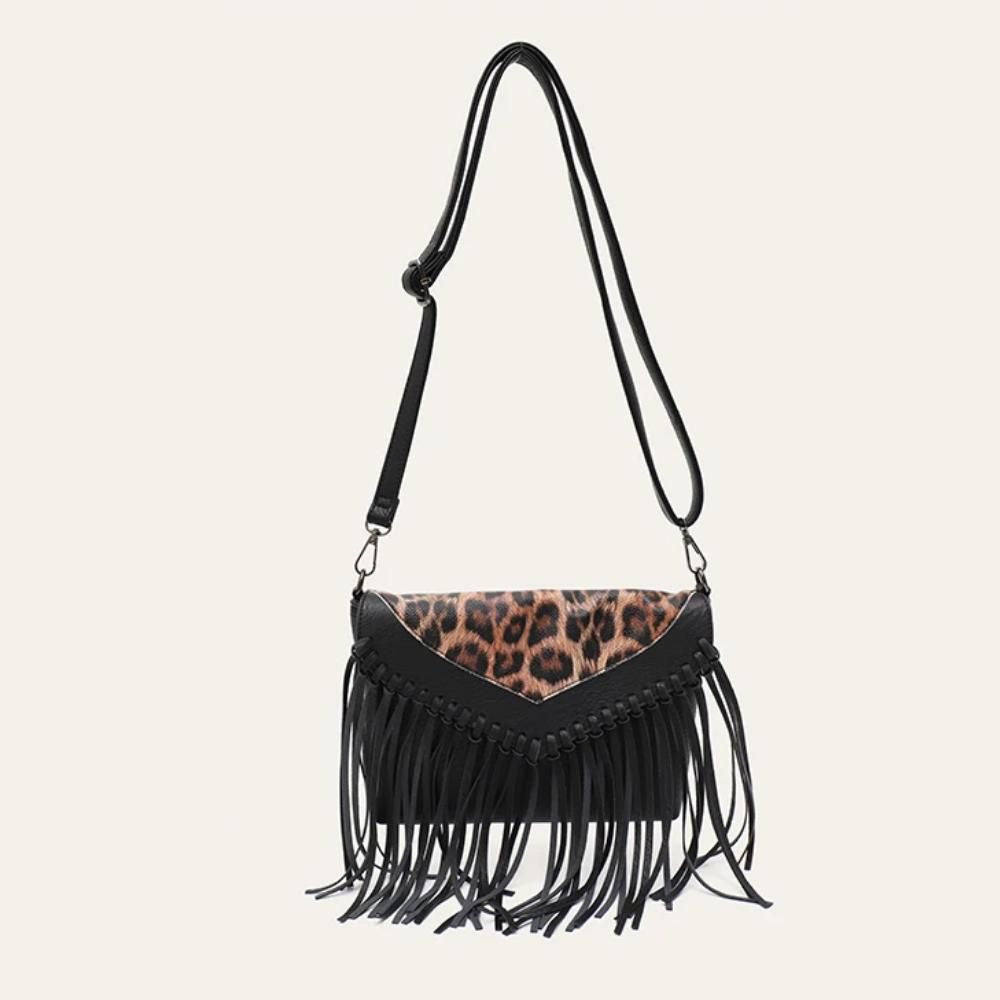 It's not just a handbag; it's a statement of your unique style and ethical choices. The combination of the bold leopard print with the playful tassel fringe offers a Bohemian charm that's hard to find. The bag's vegan leather material speaks to a conscious, cruelty-free fashion choice, aligning with modern values without sacrificing style. The practical interior, coupled with the fashionable exterior, makes this bag a must-have accessory for any fashion-forward individual.
