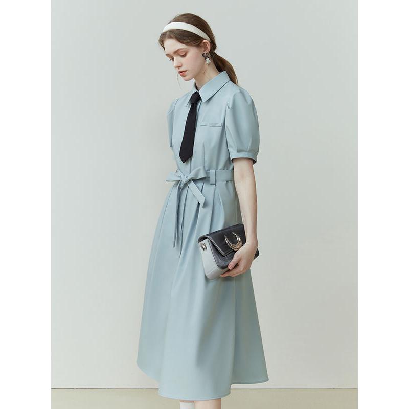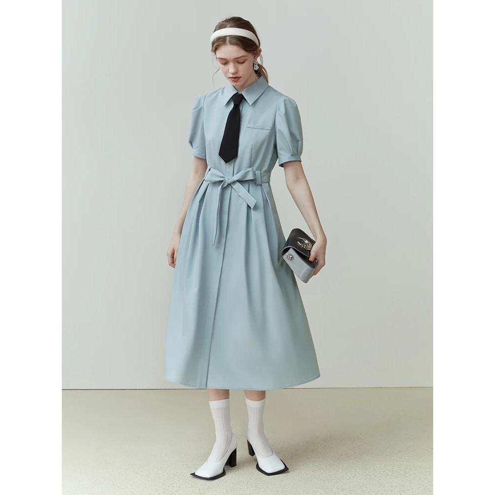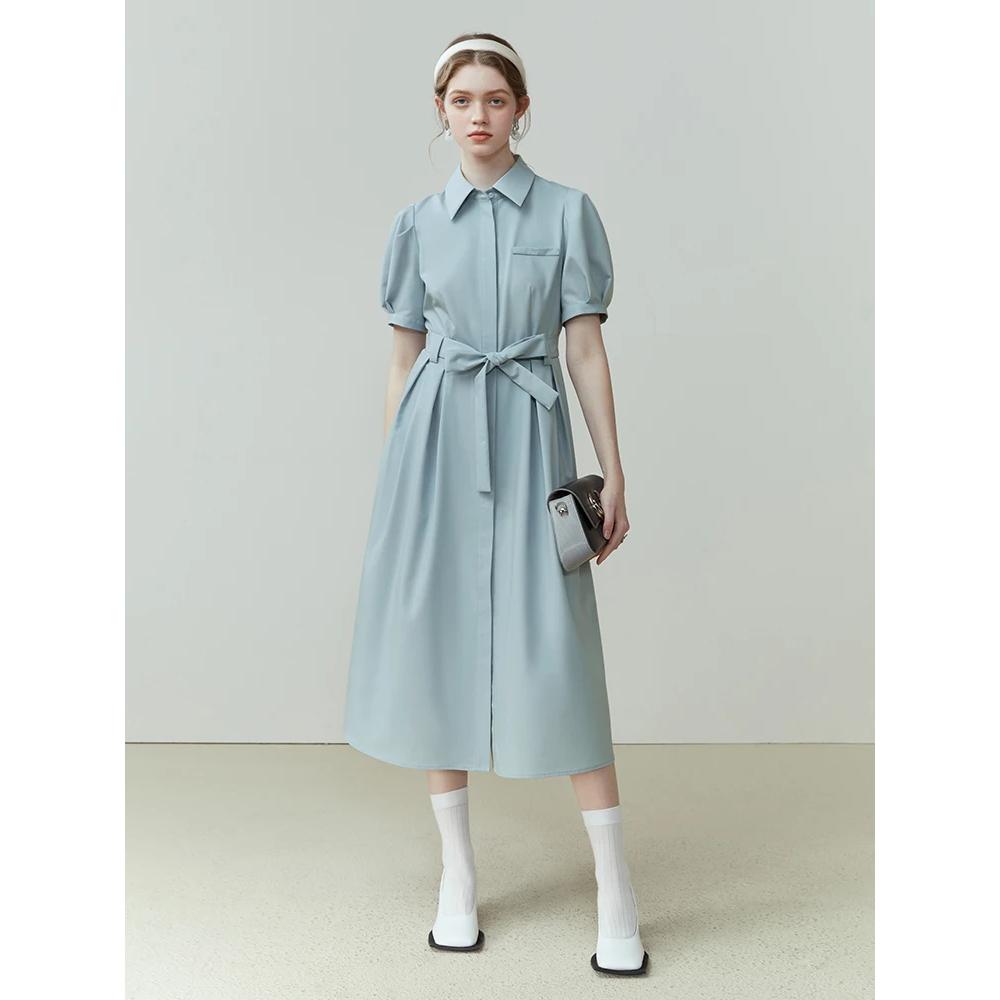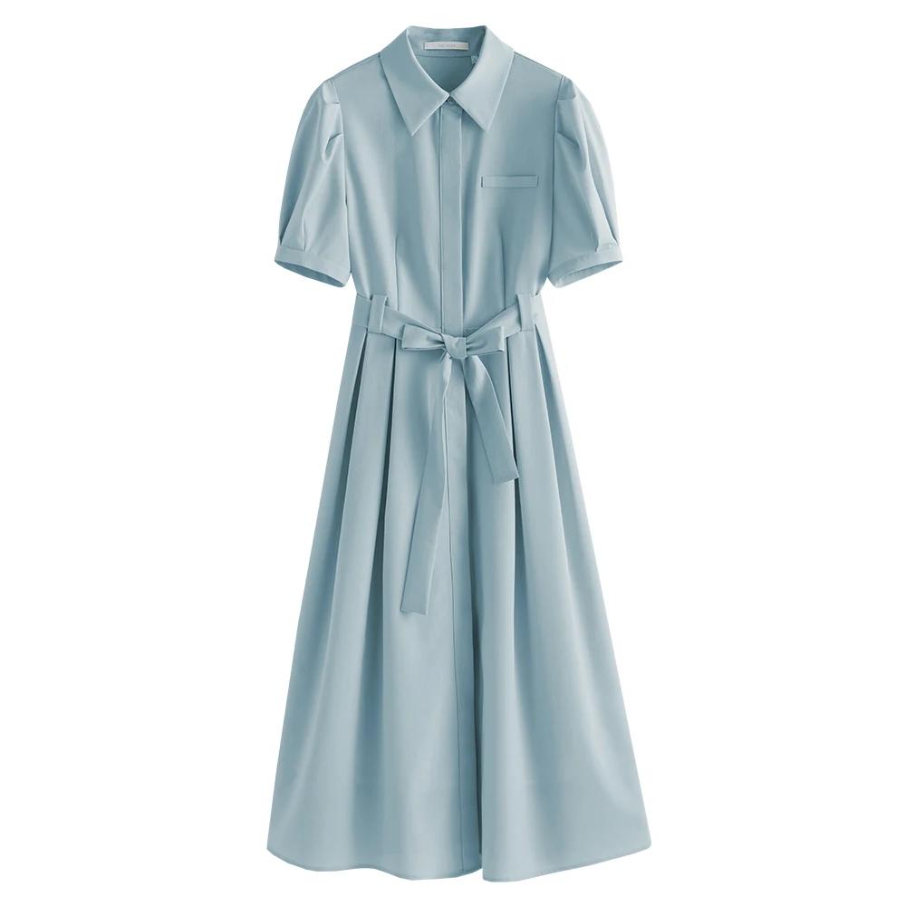 Step into the office with confidence and style in our Chic Summer Commuter Shirt Dress for Women. Designed for the modern working woman, this dress perfectly balances professionalism and fashion. Its sleek, A-line silhouette and slim waist design make it a must-have for any workplace wardrobe. Crafted from a blend of polyester, spandex, and lyocell, it offers a slight stretch for ultimate comfort while maintaining a polished look. Whether you're heading to a meeting or a lunch date, this dress is your go-to for effortless elegance. Featuring a flattering mid-calf length and a single-breasted closure, this dress exudes a refined charm. The puff sleeves add a touch of femininity, while the sashes provide a customizable fit to accentuate your waist. The solid pattern and loose fit make it versatile for various office settings, ensuring you always look poised and professional. The natural fiber composition of the fabric ensures breathability, making it ideal for those warm summer days.