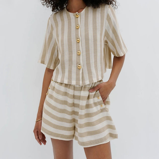 Embrace the warm weather with this Fashion Loose Stripe 2 Piece Summer Set, designed for the modern woman who values comfort and style. This chic outfit includes a short sleeve shirt and high-waist shorts, making it a perfect addition to your summer wardrobe. Whether you're strolling through the city streets or relaxing at a beachside café, this set ensures you look effortlessly fashionable.
