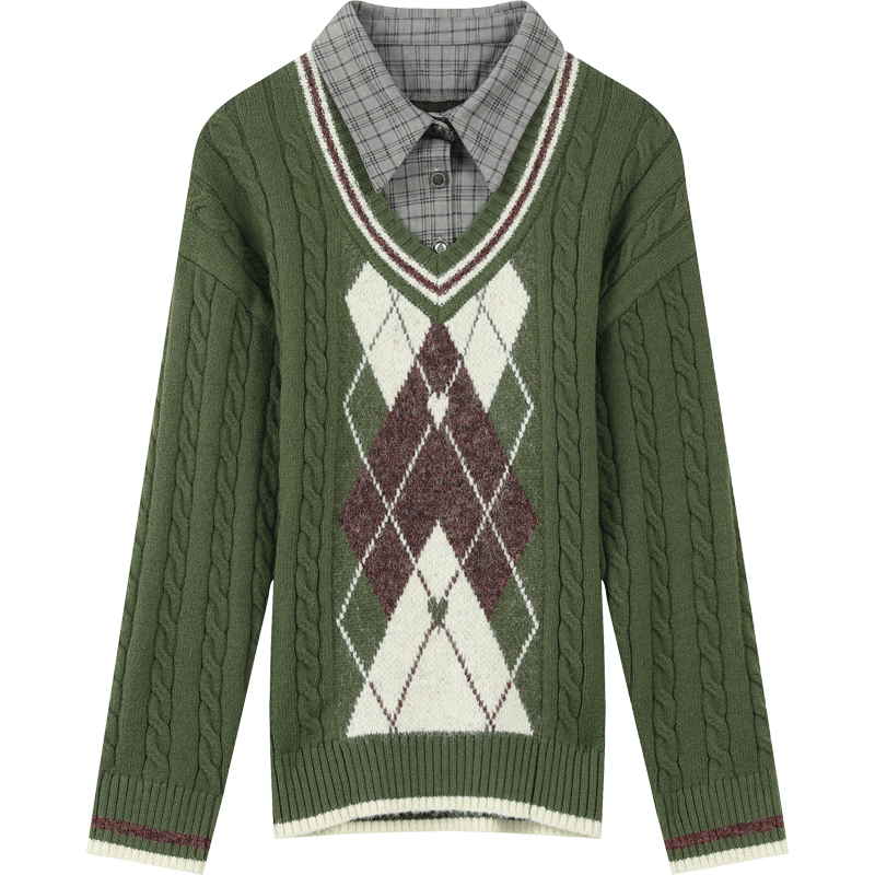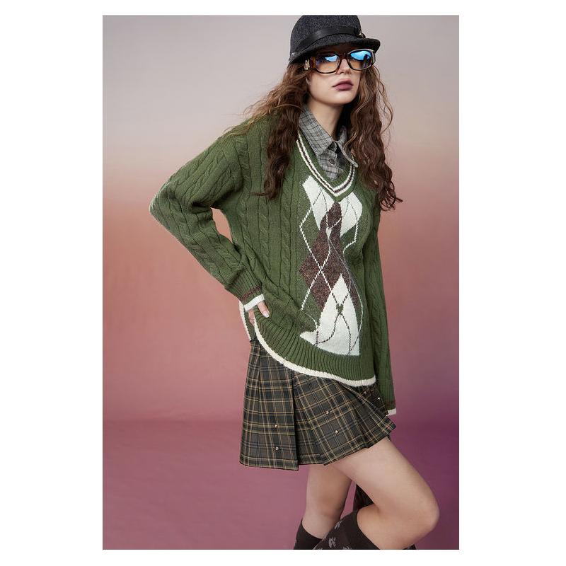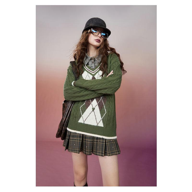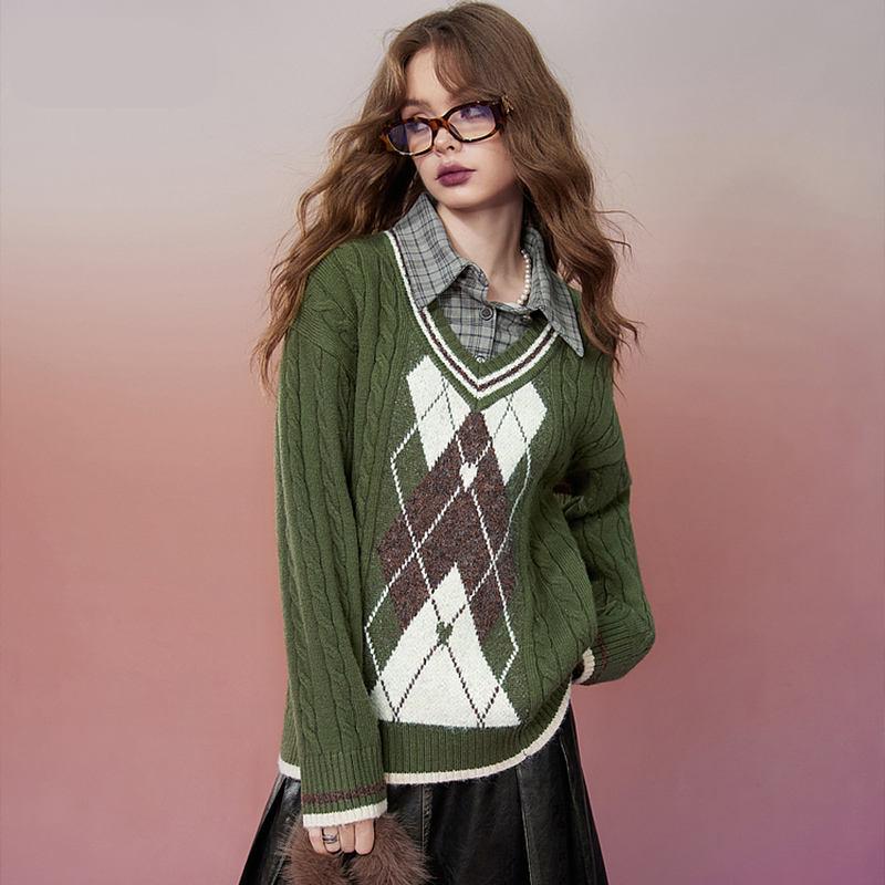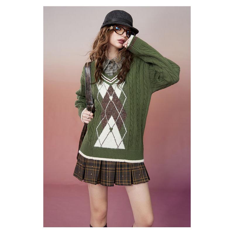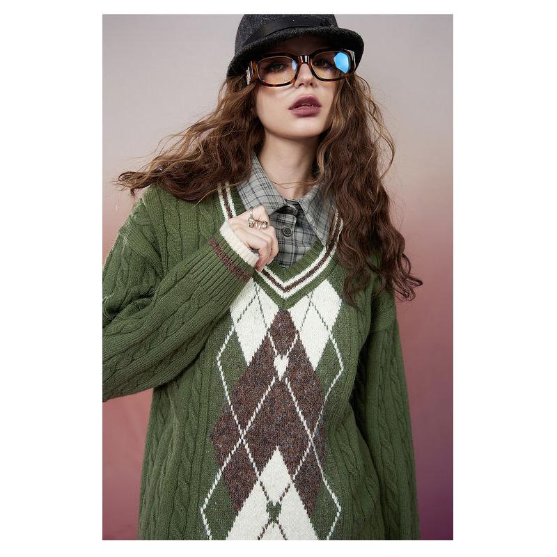 What makes this sweater special is its blend of style and practicality. The loose-fitting design ensures a relaxed and comfortable wear, perfect for layering over your favorite tops. The bold rhombus pattern adds a retro flair, making it a fashionable choice for any outing. Whether you're heading to a casual lunch, a cozy evening at home, or a weekend getaway, this sweater is your go-to choice.