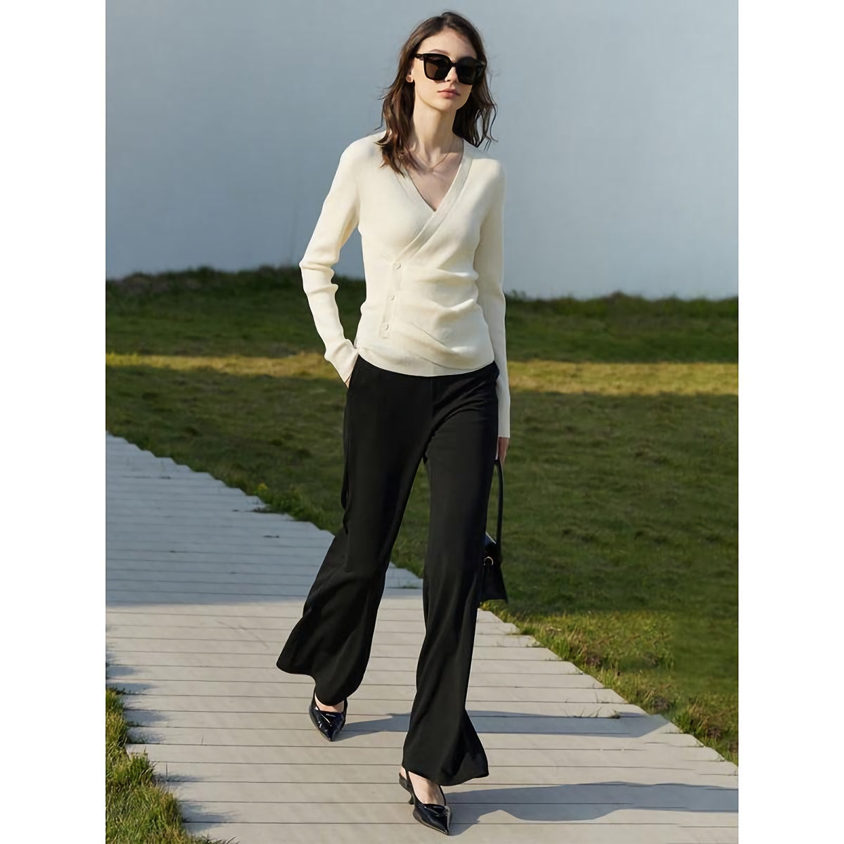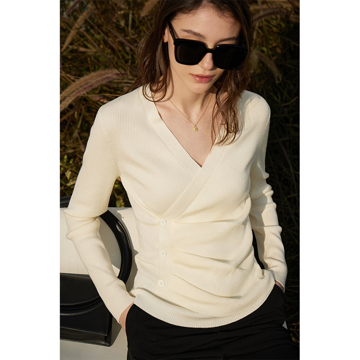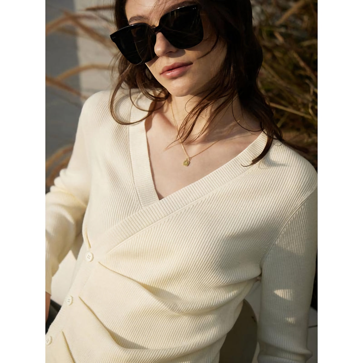Upgrade your spring collection with this chic and versatile sweater. Embrace the minimalistic design that offers both style and functionality. Order your Spring Slim V-Neck Shirred Women's Sweater now and experience the perfect blend of comfort and elegance. Make every day a stylish one!