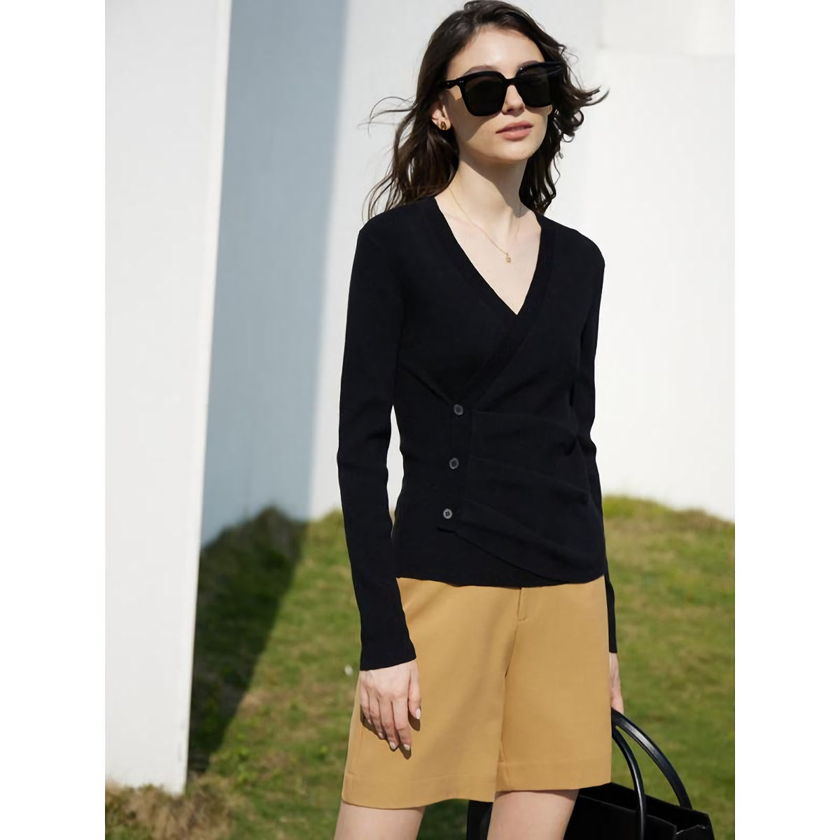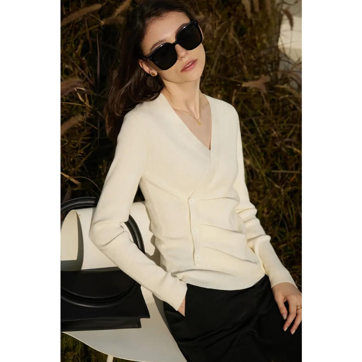 Our Spring Slim V-Neck Shirred Women's Sweater stands out with its impeccable blend of materials, offering both comfort and style. The medium stretch ensures a snug yet flexible fit, making it suitable for various body types. The elegant V-neck and pleated decoration bring a touch of sophistication to your wardrobe, making it a must-have piece for any fashion-forward woman. This sweater is best used during the spring and summer months, offering a lightweight option that can be layered over a camisole or worn alone. Whether you're at the office, attending a meeting, or out for a casual day, this sweater provides the perfect balance of professional elegance and casual comfort.