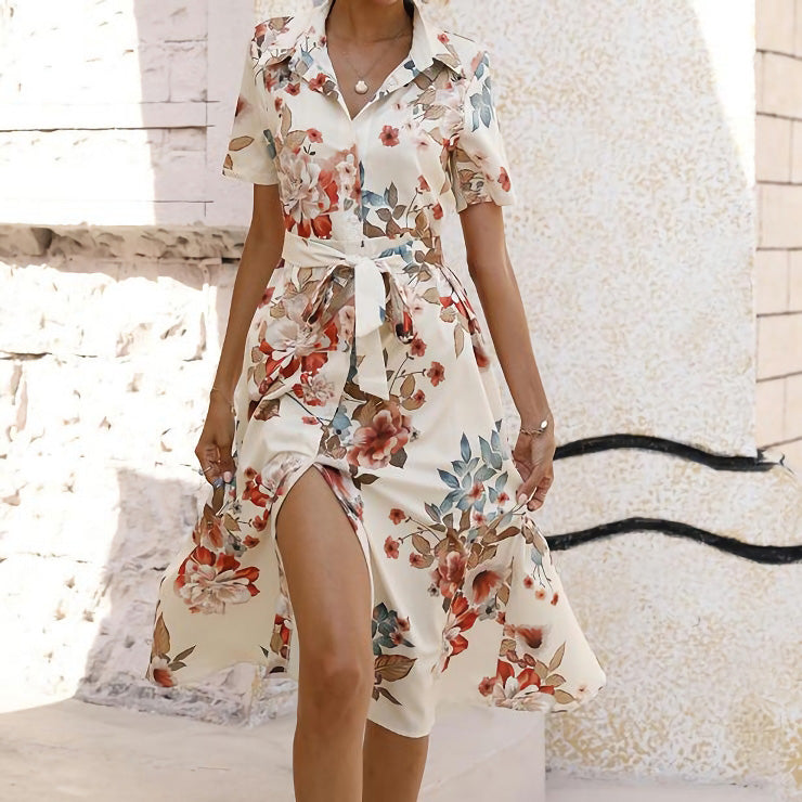 Step into elegance with our High Quality Summer Waistband Dress, a perfect blend of style and comfort for the modern woman. This hot-selling dress features a sophisticated single-breasted button design, short sleeves, and a chic lapel collar, making it an ideal choice for any occasion. The beautiful floral print adds a touch of femininity, while the A-line silhouette flatters your figure effortlessly.Product Features