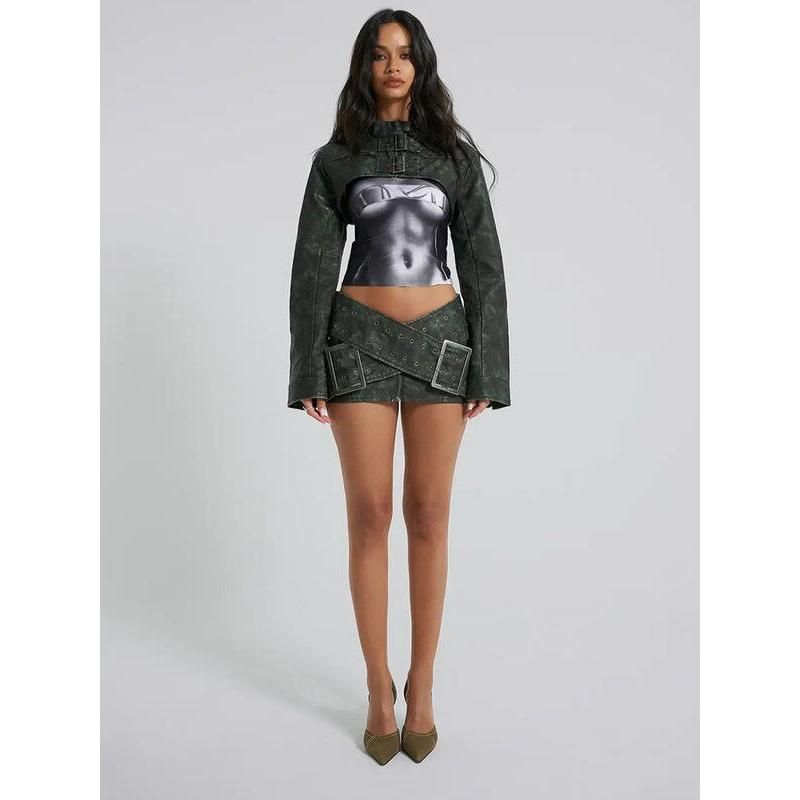 Introducing our latest fashion sensation - the Cyberpunk Y2K Faux Leather Wrap-Around Micro Mini Skirt with Belt. This is not just a skirt; it's a bold statement of style and confidence. Perfect for those who dare to stand out, this piece combines the edgy vibe of cyberpunk with the nostalgic flair of Y2K fashion.