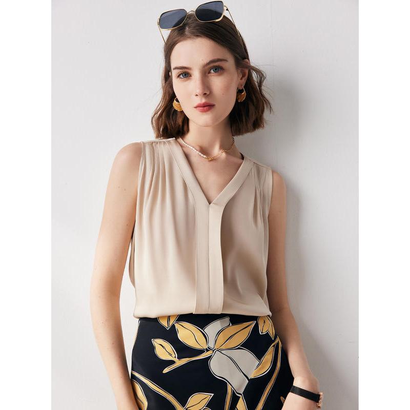 Step into summer with style in our Elegant Summer Silk Blouse. Designed for the sophisticated woman, this blouse is a perfect blend of luxury and functionality, tailored to enhance your wardrobe with a touch of elegance. Its sleek, sleeveless design and smooth V-neck collar make it a stellar pick for both office wear and casual outings.