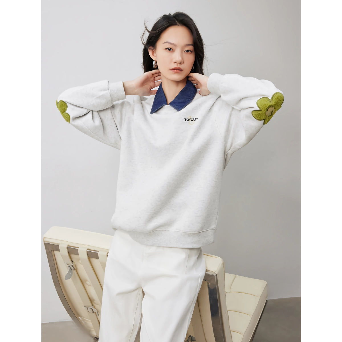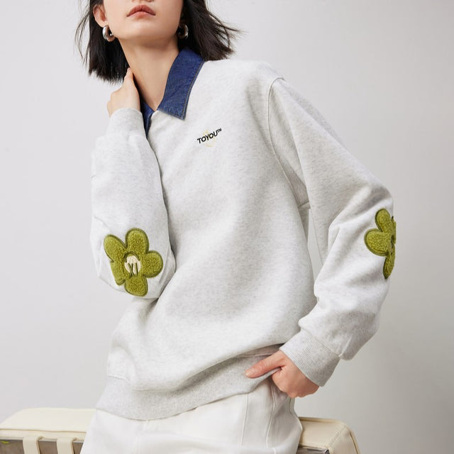 Our Floral Patchwork Sleeve Casual Pullover Sweatshirt is more than just a piece of clothing; it's a statement of style and comfort. Ideal for ages 25-35, this top is perfect for the modern woman who values both fashion and practicality. The loose fit and slight stretch ensure you can move freely, making it ideal for various activities, from office work to casual outings. What sets this sweatshirt apart is its unique flower patchwork on the sleeves, adding a touch of femininity and charm to a classic silhouette. The solid pattern makes it versatile and easy to pair with your favorite jeans, skirts, or trousers, making it a staple in your autumn and winter wardrobe.Get Yours Now!