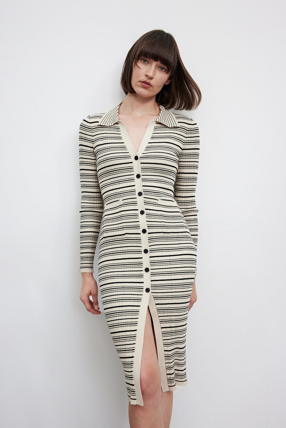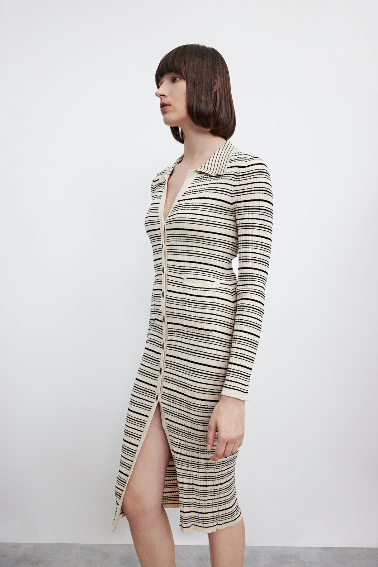 This exquisite dress is crafted from a high-quality cotton blend, offering both softness and durability. The medium stretch fabric ensures a comfortable fit that moves with you. The V-neckline and striped lapel add a unique touch of elegance, while the button decoration enhances the overall aesthetic. The sheath silhouette and mid-calf length create a flattering, elongated look, making this dress perfect for various occasions.- Material: High-quality cotton blend for softness and durability