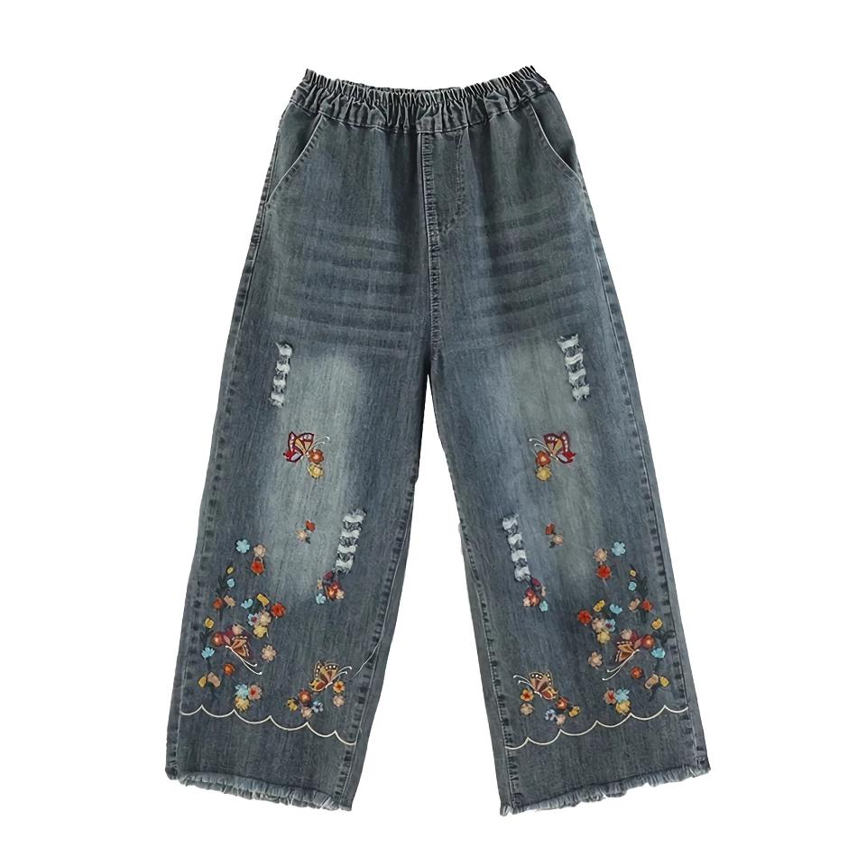 Boho Style Embroidered Wide Leg Denim Pants