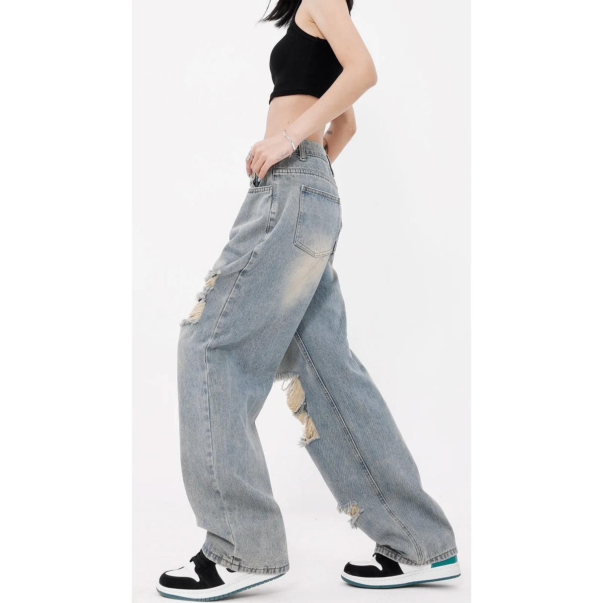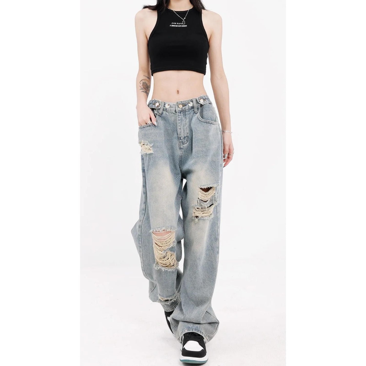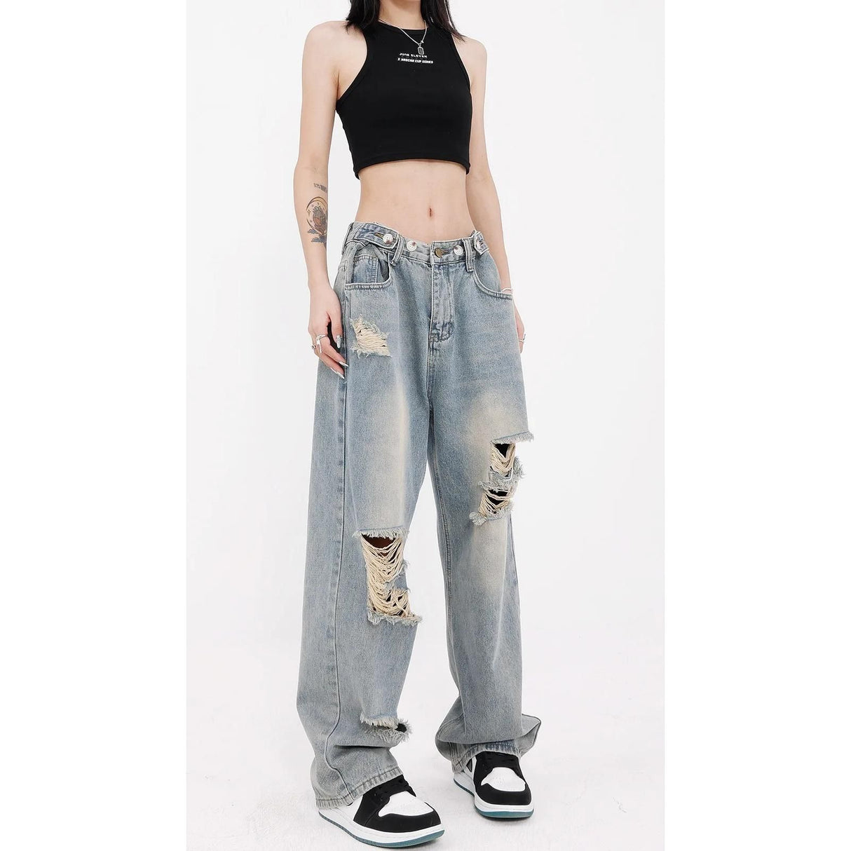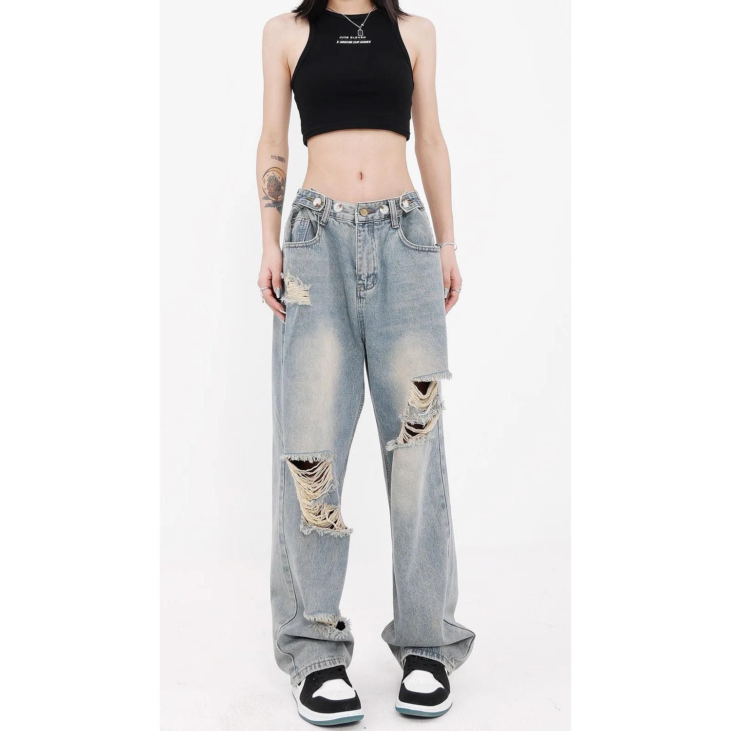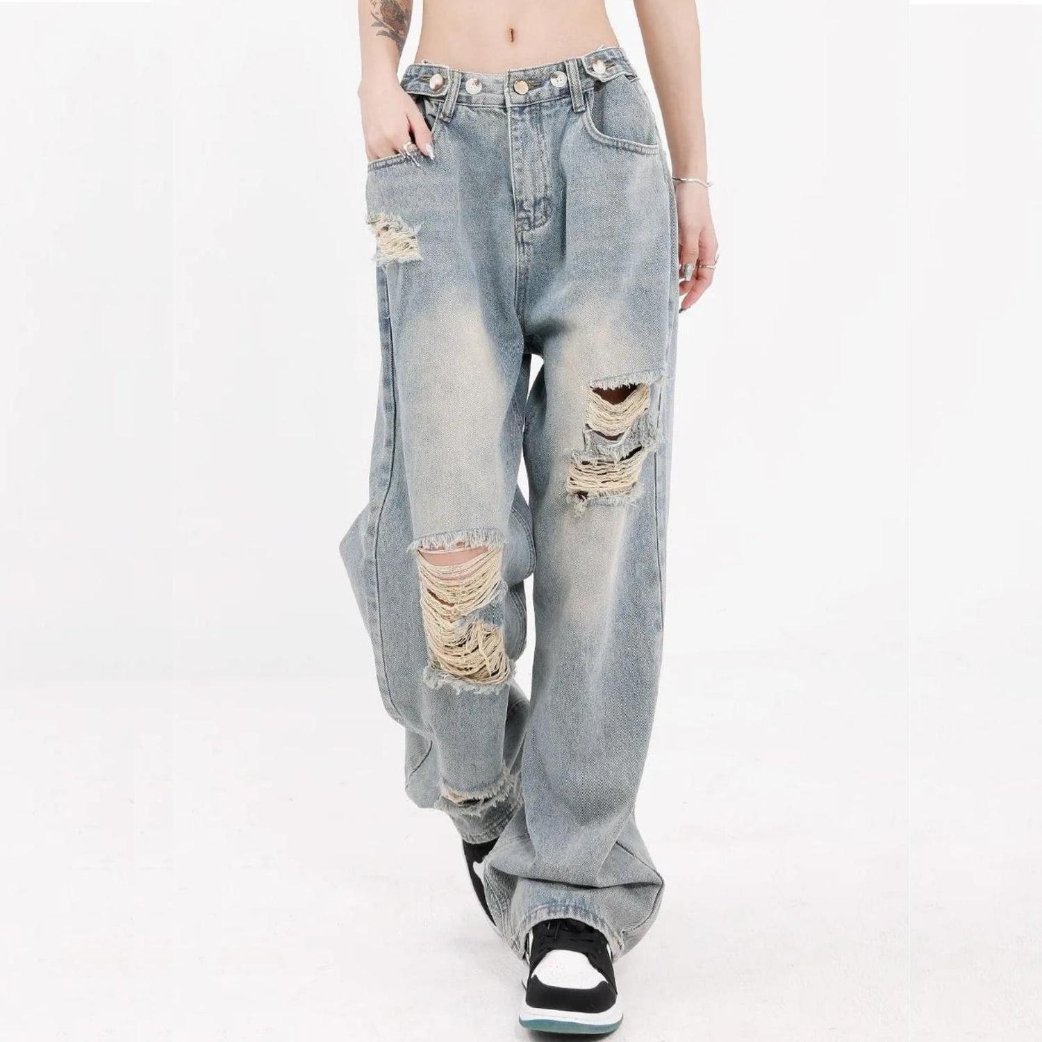 Every pair of these jeans boasts a unique gradient wash, giving them an edgy, street-style vibe. The high-waist design, coupled with a loose fit, ensures comfort without compromising on style. A combination of practical features like button decorations, pockets, and a zipper fly, alongside fashion-forward elements such as fake zippers and tasteful distressing, makes these jeans a must-have in your wardrobe.