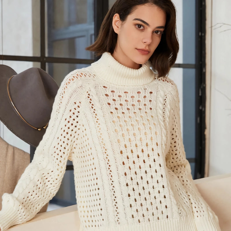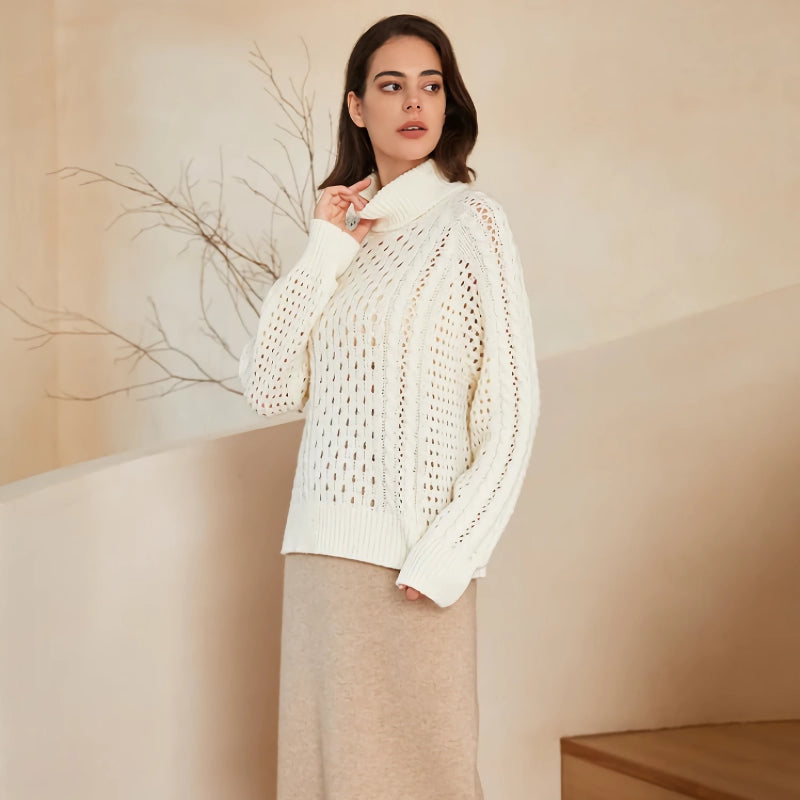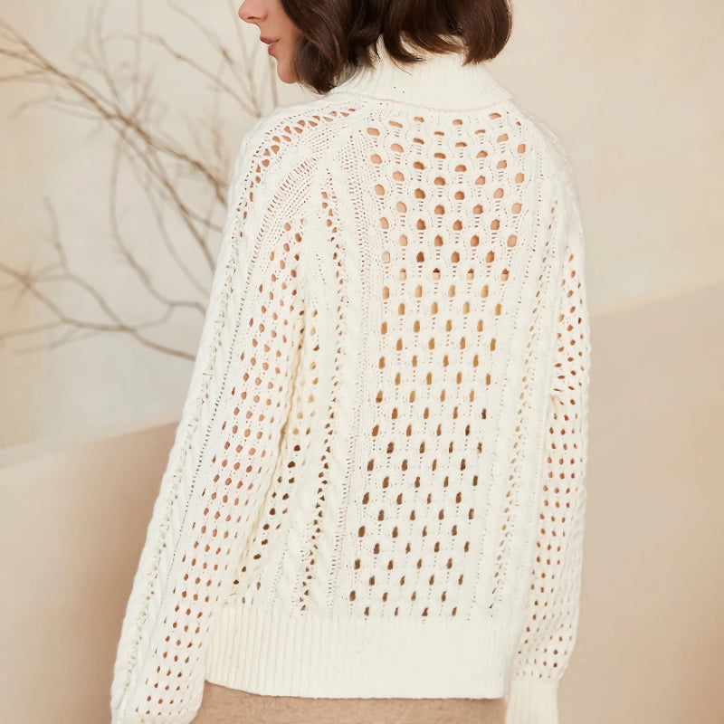 Our turtleneck cardigan sweater stands out for its superior quality and thoughtful design. The 100% wool material ensures you stay warm and cozy even on the coldest days, while the hollow out decoration adds a stylish flair that sets it apart from ordinary sweaters. The loose fit and slight stretch make it incredibly comfortable, allowing for easy movement and all-day wear.Perfect for Autumn and Winter