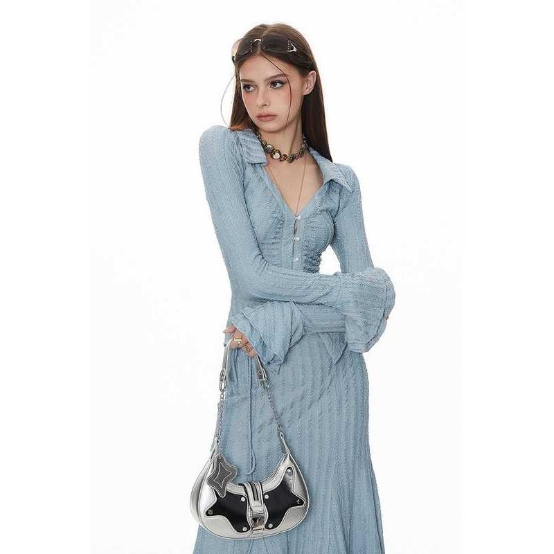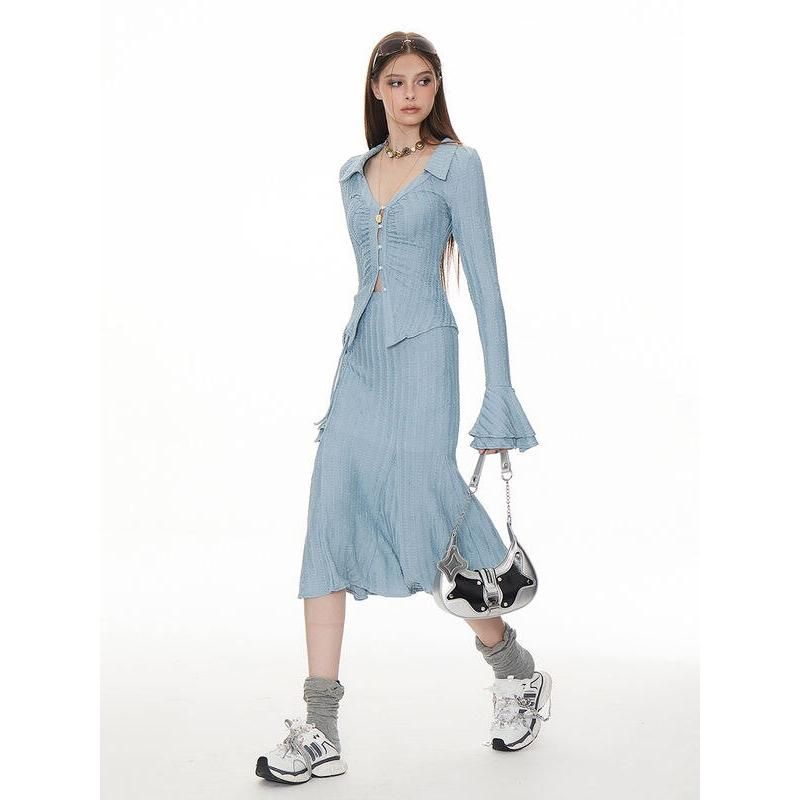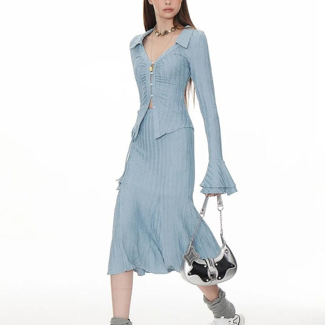 This captivating set features a V-neck, flare-sleeved cardigan paired with a bandage fishtail long skirt. Crafted with a blend of cotton and polyester, the fabric ensures comfort while maintaining a chic silhouette. The intricate details, including draped accents, ruched patterns, buttons, and a single-breasted closure, add a touch of glamour to your ensemble.
