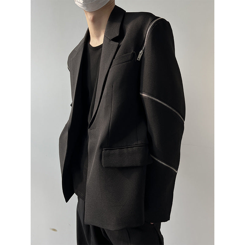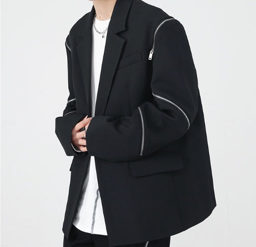 Men's Zippered Sleeve Splicing Black Suit