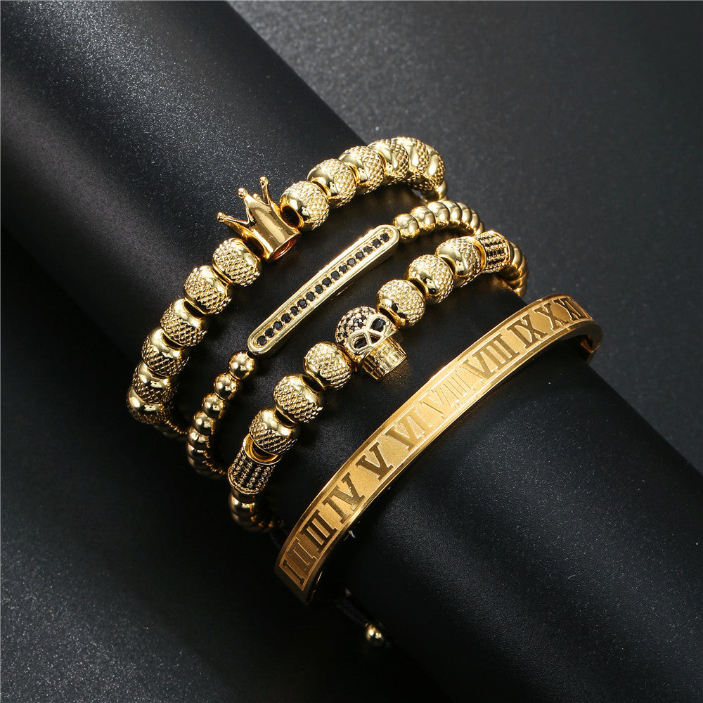 Stainless Steel Roman Letter Copper Inlaid Zircon Crown Skull Bracelet