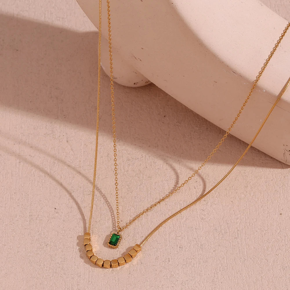 Elevate your style with this stunning 18K gold-plated double-layer necklace, featuring a delicate green rhinestone pendant. Designed with elegance and versatility in mind, this necklace is crafted from high-quality 316L stainless steel, ensuring long-lasting shine and durability. The geometric square bead pendant adorned with a green rhinestone adds a pop of color, making it perfect for both casual outings and special occasions. Whether you're dressing up for a night out or looking to add some sophistication to your everyday look, this necklace will add the perfect finishing touch.Quality You Can Rely On