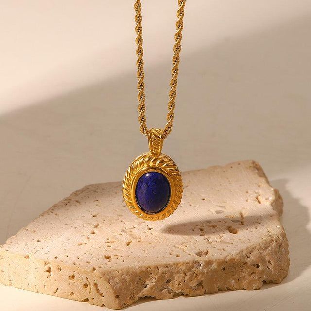 Add a touch of timeless elegance to your wardrobe with this luxurious 18K Gold Plated Stainless Steel Rope Chain Necklace featuring a captivating oval-shaped lapis stone pendant. This striking necklace combines the durability of stainless steel with the sophistication of gold, giving you a piece of jewelry that is not only beautiful but also long-lasting. Whether you're dressing up for a special occasion or adding a stylish flair to your everyday outfits, this necklace is the perfect accessory.Features