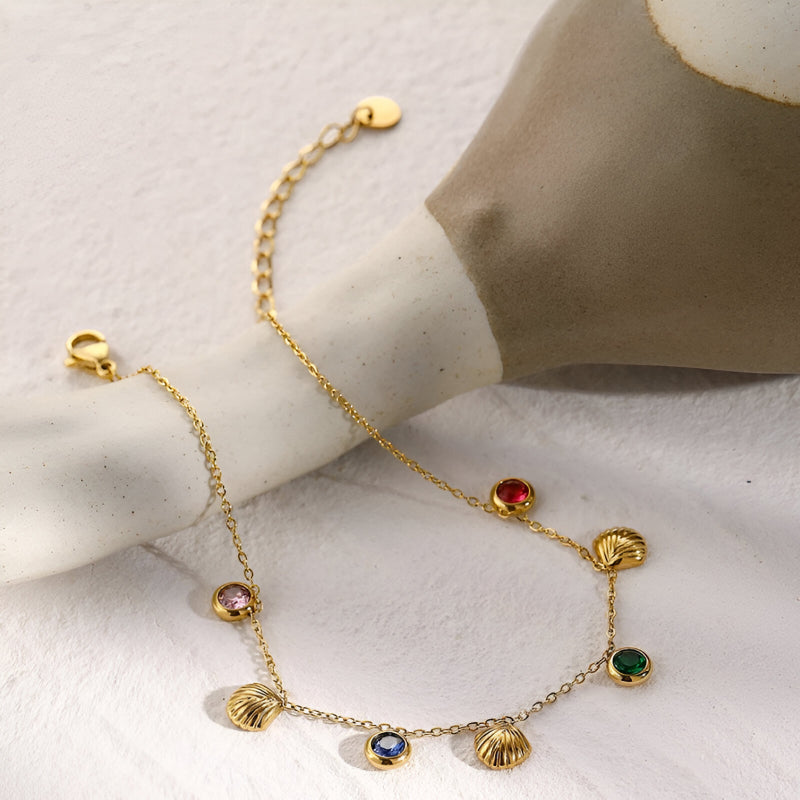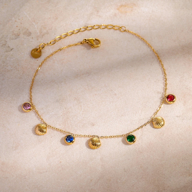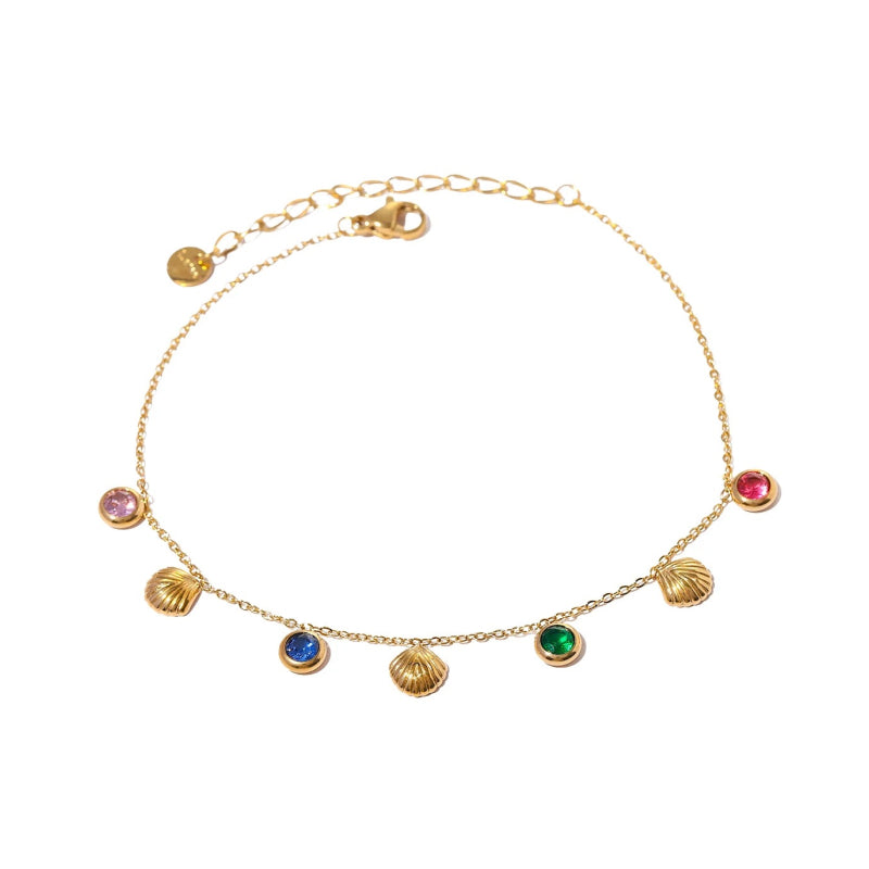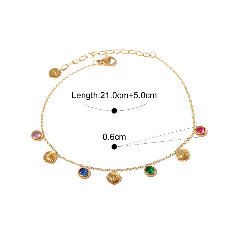 Whether you're going for a beach vacation, attending a poolside party, or simply adding a touch of glam to your everyday outfits, this 18K gold-plated anklet will complement your style. The colorful cubic zirconia stones make it perfect for sunny days, while the elegant shell design brings a touch of nature-inspired charm. Lightweight and comfortable, this anklet pairs beautifully with sandals, flip-flops, or even barefoot beach looks.