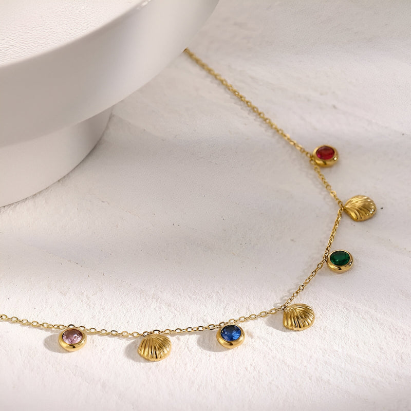 Step into summer with the 18K Gold Plated Shell Cubic Zirconia Anklet—an exquisite accessory that captures the essence of warm beach days and carefree moments. Featuring a delicate shell charm paired with colorful, shiny cubic zirconia stones, this anklet is a must-have for those who want to add a pop of fun and sparkle to their look. Crafted from high-quality stainless steel with 18K PVD gold plating, this trendy foot chain offers a perfect balance of fashion and durability. Whether you're heading to the beach, pool, or an outdoor party, this anklet will elevate your style effortlessly.