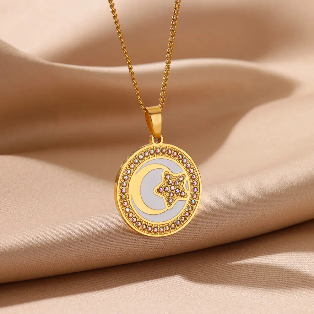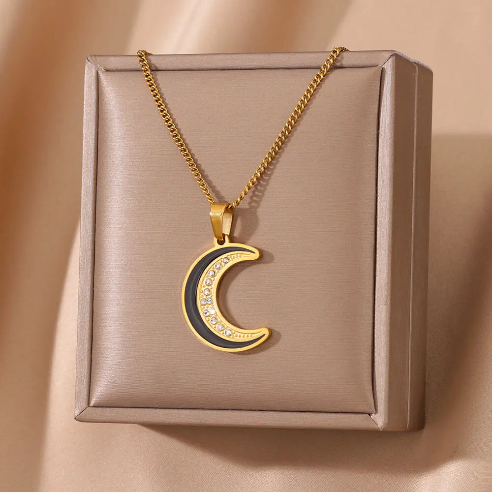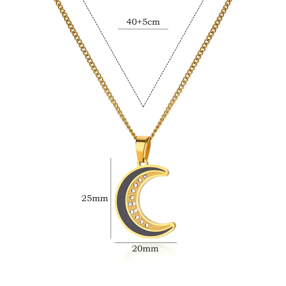 Gold Moon Pendant Necklace with Cubic Zirconia – Trendy Stainless Steel Jewelry