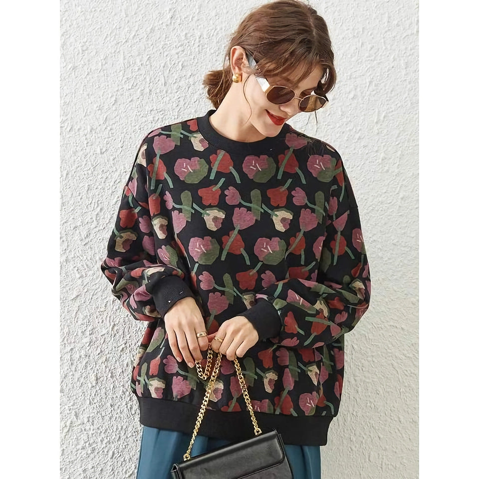 Sudadera holgada con estampado floral retro - Estilo informal - S / Negro está agotado y se enviará tan pronto como vuelva a estar disponible.
